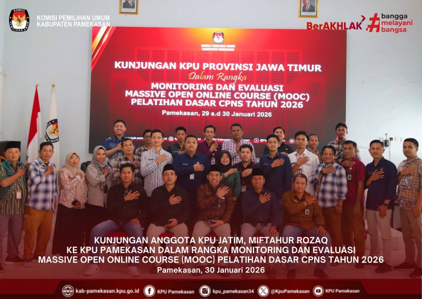 PAMEKASAN – Anggota Komisi Pemilihan Umum (KPU) Provinsi Jawa Timur, Miftahur Rozaq, melakukan kunjungan kerja ke Kantor KPU Kabupaten Pamekasan pada Jumat (30/1/2026). Kunjungan ini dilaksanakan dalam rangka Monitoring dan Evaluasi (Monev) pelaksanaan Massive Open Online Course (MOOC) Pelatihan Dasar (Latsar) CPNS Tahun 2026. Kegiatan yang berlangsung di Aula Kantor KPU Pamekasan tersebut dihadiri oleh Ketua KPU Pamekasan, jajaran sekretariat, serta 6 orang CPNS formasi tahun 2024 yang sedang menjalani masa pelatihan. Sambutan Hangat Ketua KPU Pamekasan Acara dibuka dengan sambutan dari Ketua KPU Pamekasan, Mahdi. Dalam penyampaiannya, Mahdi mengucapkan terima kasih dan apresiasi atas kehadiran Miftahur Rozaq di Bumi Gerbang Salam. "Kami sangat berterima kasih atas kehadiran Bapak Rozaq. Kehadiran beliau merupakan motivasi besar bagi kami di daerah, terutama bagi rekan-rekan CPNS yang sedang menempuh tahapan Latsar, agar tetap fokus dan maksimal dalam menjalankan tugas," ujar Mahdi. Arahan Strategis dan Apresiasi Media Sosial Dalam arahannya, Miftahur Rozaq menekankan pentingnya kedisiplinan dan integritas bagi para CPNS selama mengikuti MOOC. Beliau mengingatkan bahwa Latsar adalah pondasi awal bagi seorang Aparatur Sipil Negara (ASN) di lingkungan KPU untuk memahami regulasi dan etika kerja. Selain memberikan arahan teknis, Rozaq juga memberikan pujian terhadap performa komunikasi publik KPU Pamekasan. Beliau mengapresiasi pengelolaan media sosial KPU Pamekasan yang dinilai sangat aktif dan variatif. "Konten media sosial KPU Pamekasan sudah bagus, informasinya tidak monoton dan selalu update. Hal ini sangat penting agar masyarakat tidak merasa jenuh dalam menerima informasi kepemiluan," ungkap Rozaq. Interaksi dengan CPNS Suasana menjadi lebih hangat saat Rozaq meminta ke-6 CPNS KPU Pamekasan untuk memperkenalkan diri satu persatu. Tidak hanya sekadar berkenalan, ia juga membuka ruang diskusi mengenai kendala-kendala yang dihadapi selama mengikuti pelatihan daring (online). Beberapa poin yang dibahas dalam sesi diskusi tersebut antara lain: Stabilitas jaringan dalam mengakses platform MOOC. Manajemen waktu antara pekerjaan kantor dan modul pelatihan. Pemahaman substansi materi pelatihan yang berbasis mandiri. Kunjungan ini diakhiri dengan sesi foto bersama dan diharapkan dapat meningkatkan semangat kerja serta kualitas SDM di lingkungan KPU Kabupaten Pamekasan demi menyukseskan tahapan-tahapan pemilu mendatang. ....