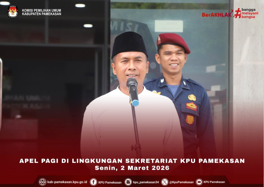PAMEKASAN – Komisi Pemilihan Umum (KPU) Kabupaten Pamekasan kembali melaksanakan rutinitas apel pagi di halaman Kantor KPU Pamekasan, Jalan Brawijaya no.34 Pamekasan, pada Senin (2/3/2026). Kegiatan yang dimulai tepat pukul 08.00 WIB ini diikuti oleh seluruh jajaran sekretariat dengan penuh khidmat. Kedisiplinan dan Kebersamaan Apel rutin kali ini dipimpin langsung oleh Ketua KPU Pamekasan, Bapak Mahdi, S.Pd.I., yang bertindak sebagai pembina apel. Tampak hadir dalam barisan peserta, Sekretaris KPU Pamekasan, Panji Kuncoro, beserta Kasubbag dan seluruh staf di lingkungan Sekretariat KPU Pamekasan. Kegiatan apel pagi merupakan agenda rutin yang terus dijaga oleh KPU Pamekasan guna memperkuat koordinasi, kedisiplinan, serta memastikan kesiapan personel sebelum memulai aktivitas pelayanan dan kerja-kerja kepemiluan selama sepekan ke depan. Arahan Menjelang Bulan Suci Ramadan Dalam amanatnya, Mahdi memberikan poin penting terkait performa kerja mengingat saat ini telah memasuki bulan suci Ramadan. Beliau menekankan agar ibadah puasa tidak menjadi alasan menurunnya produktivitas kerja. "Bulan Ramadan adalah bulan yang penuh keberkahan. Saya berharap seluruh jajaran tetap menjaga semangat dan integritas dalam menjalankan tugas. Mari kita jadikan momentum puasa ini untuk meningkatkan etos kerja yang berbasis pada keikhlasan dan pengabdian kepada masyarakat," ujar Mahdi dalam arahannya. Komitmen Pelayanan Senada dengan hal tersebut, koordinasi antar-divisi tetap menjadi prioritas utama untuk memastikan seluruh agenda tahapan berjalan sesuai jadwal. Apel pagi ditutup dengan doa bersama untuk kelancaran tugas-tugas KPU ke depan. Dengan pelaksanaan apel rutin ini, KPU Pamekasan berkomitmen untuk tetap solid dan profesional dalam menjalankan mandat undang-undang, baik dalam masa tahapan pemilu maupun dalam aktivitas rutin administrasi perkantoran. ....