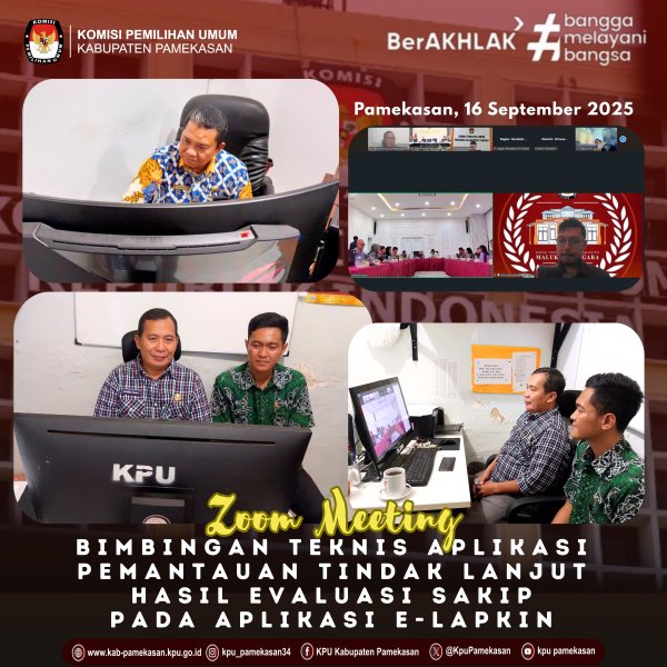 Pamekasan - Dalam upaya meningkatkan akuntabilitas kinerja, Sekretaris Komisi Pemilihan Umum (KPU) Kabupaten Pamekasan, Panji Kuncoro, dan Kepala Subbagian (Kasubbag) Rendatin, Akhmad Erfan Kusmanto, menghadiri Bimbingan Teknis (Bimtek) secara daring pada Selasa, 16 September 2025. Bimtek ini membahas Penggunaan Aplikasi Pemantauan Tindak Lanjut Hasil Evaluasi Sistem Akuntabilitas Kinerja Instansi Pemerintah (SAKIP) pada Aplikasi E-Lapkin.