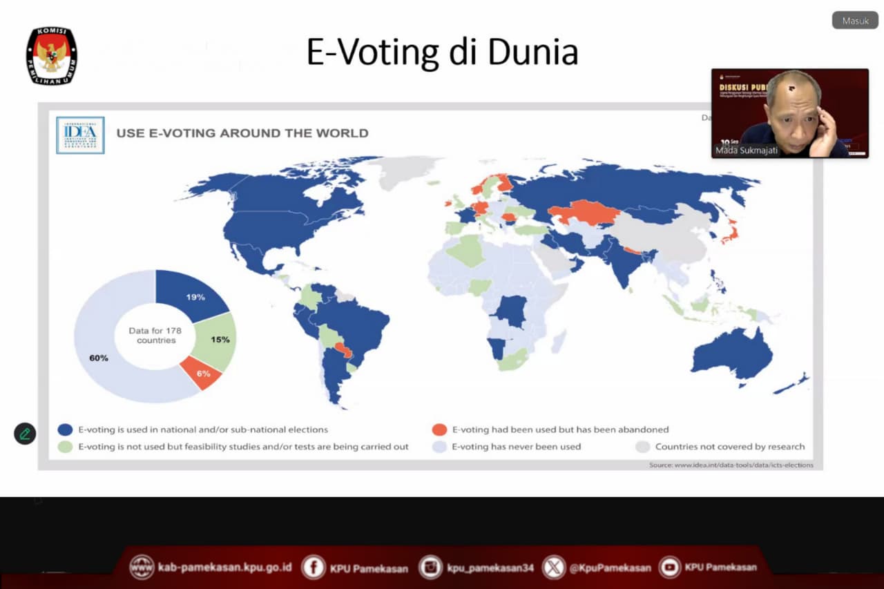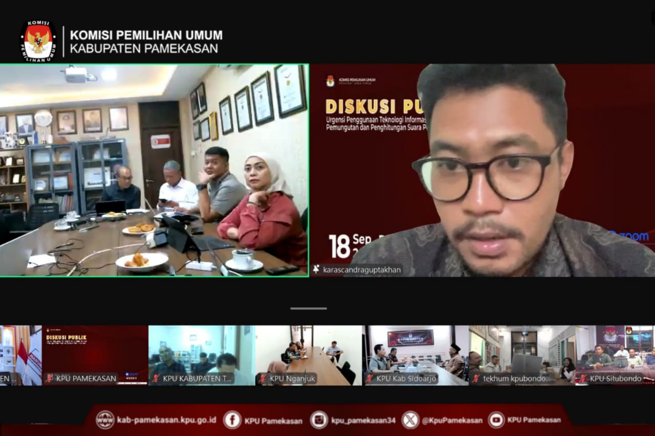Pamekasan, Media Center KPU Pamekasan – Komisi Pemilihan Umum (KPU) Kabupaten Pamekasan mengikuti Diskusi Publik secara daring melalui zoom meeting pada hari Kamis, 18 September 2025. Acara ini diselenggarakan KPU RI dengan tema "Urgensi Penggunaan Teknologi Informasi dalam Tahapan Pemungutan dan Penghitungan Suara Pemilihan Umum."
