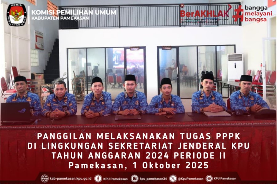 Pamekasan, 1 Oktober 2025 — Pegawai Pemerintah dengan Perjanjian Kerja (PPPK) yang baru lolos seleksi di lingkungan Komisi Pemilihan Umum (KPU) Kabupaten Pamekasan hari ini mengikuti Zoom Meeting Panggilan Melaksanakan Tugas PPPK Tenaga Teknis dan Tenaga Kesehatan Tahun Anggaran 2024 Periode II. Acara yang diselenggarakan oleh KPU Provinsi ini dimulai pukul 10.00 WIB.