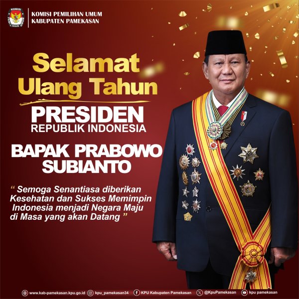 Dalam kesempatan istimewa ini, KPU Pamekasan mendoakan agar Bapak Presiden Prabowo Subianto senantiasa diberikan kesehatan yang prima, kekuatan dan kesuksesan dalam memimpin bangsa dan negara Indonesia.