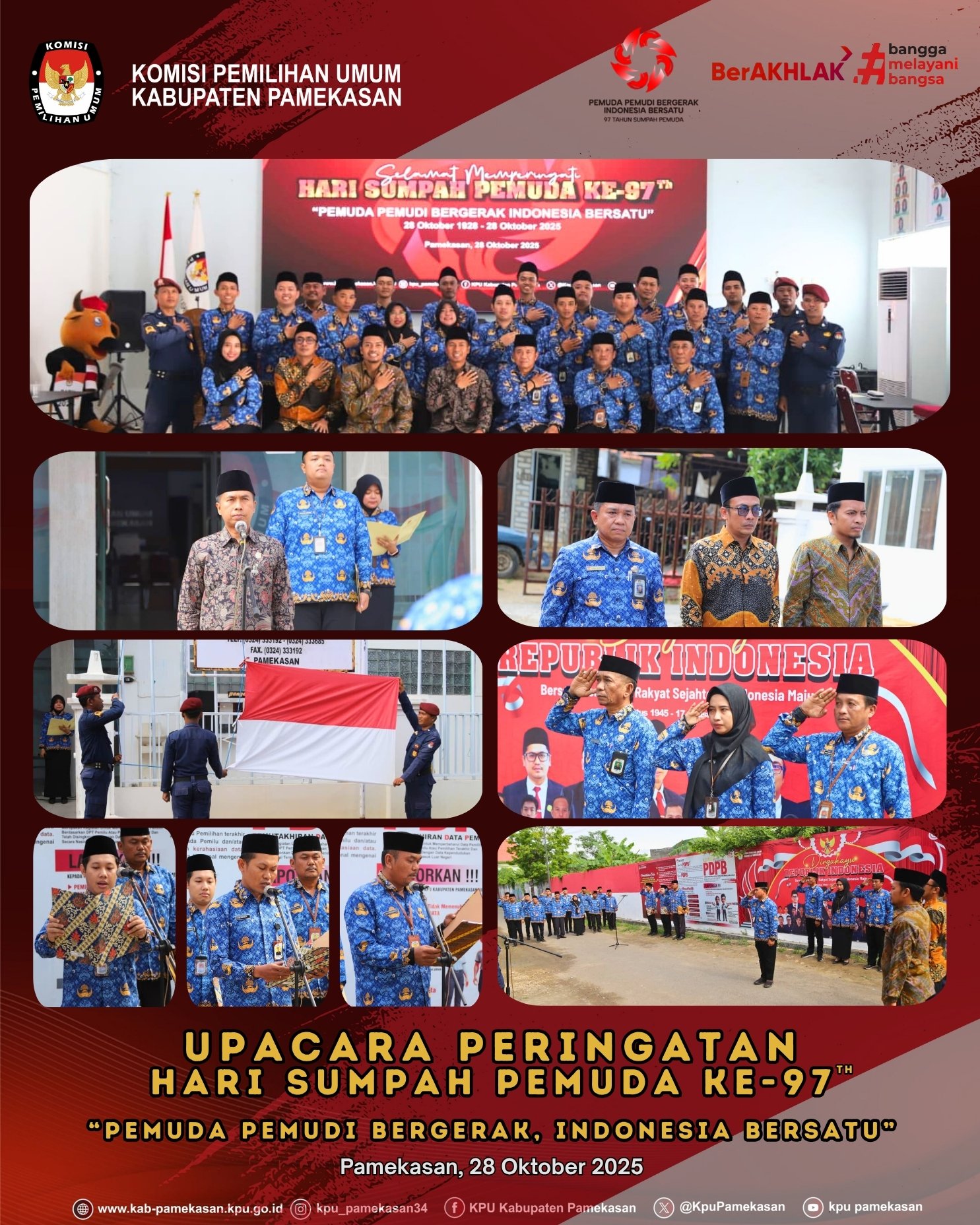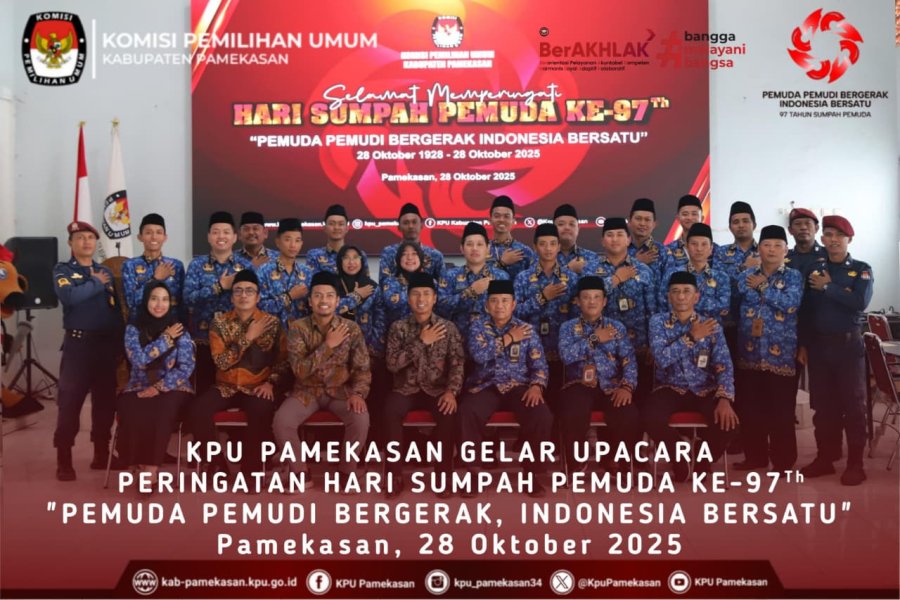 PAMEKASAN – Komisi Pemilihan Umum (KPU) Kabupaten Pamekasan menggelar upacara peringatan Hari Sumpah Pemuda yang ke-97 tahun 2025 dengan khidmat. Upacara ini dilaksanakan tepat pada tanggal 28 Oktober 2025 pukul 08.00 WIB di halaman kantor KPU Pamekasan.