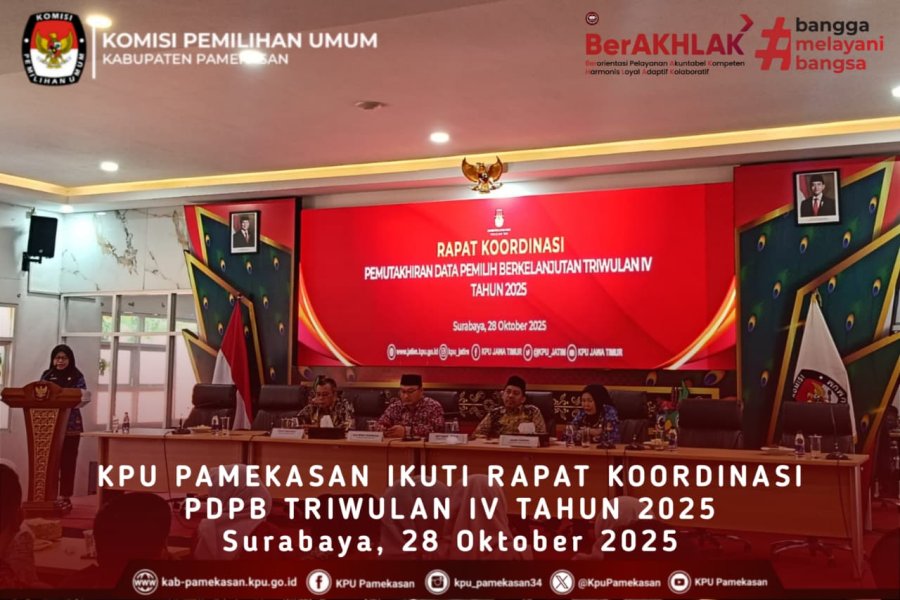 SURABAYA – Komisi Pemilihan Umum (KPU) Kabupaten Pamekasan menghadiri Rapat Koordinasi Pemutakhiran Data Pemilih Berkelanjutan (PDPB) Triwulan IV Tahun 2025. Kegiatan penting ini diselenggarakan oleh KPU Provinsi Jawa Timur pada Selasa, 28 Oktober 2025, mulai pukul 09.00 WIB hingga selesai, bertempat di Aula Kantor KPU Provinsi Jawa Timur di Jl. Raya Tenggilis No. 1-3, Tenggilis Mejoyo, Kota Surabaya.