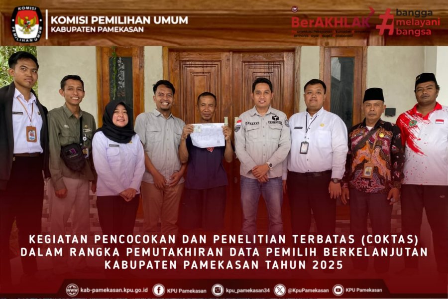 Pamekasan, 30 Oktober 2025 – Komisi Pemilihan Umum (KPU) Kabupaten Pamekasan kembali menegaskan komitmennya dalam menjaga validitas dan akurasi Daftar Pemilih Berkelanjutan (DPB). Pada hari ini, Kamis, 30 Oktober 2025, tim KPU Pamekasan melaksanakan kegiatan Pencocokan dan Penelitian Terbatas (Coktas) yang kali ini menyasar wilayah Kecamatan Batumarmar.