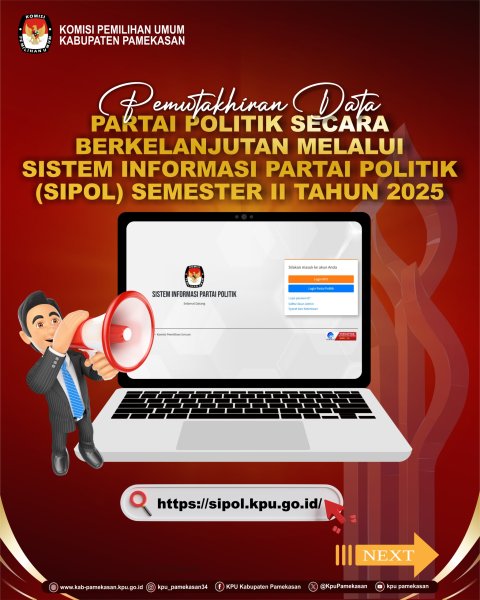 Hai #TemanPemilih, guna memastikan data partai politik (parpol) yang valid, akurat dan mutakhir, Komisi Pemilihan Umum Kabupaten Pamekasan telah mensosialisasikan kepada Partai Politik Tingkat Kabupaten Pamekasan untuk melakukan Pemutakhiran Data Parpol Secara Berkelanjutan Melalui Sistem Informasi Politik (Sipol) Semester II Tahun 2025.