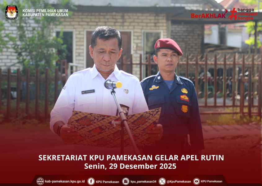 PAMEKASAN – Seluruh jajaran staf Sekretariat Komisi Pemilihan Umum (KPU) Kabupaten Pamekasan melaksanakan kegiatan apel pagi rutin pada Senin (29/12/2025). Bertempat di halaman kantor KPU Kabupaten Pamekasan, kegiatan yang dimulai tepat pukul 08.00 WIB ini berlangsung dengan khidmat dan disiplin.