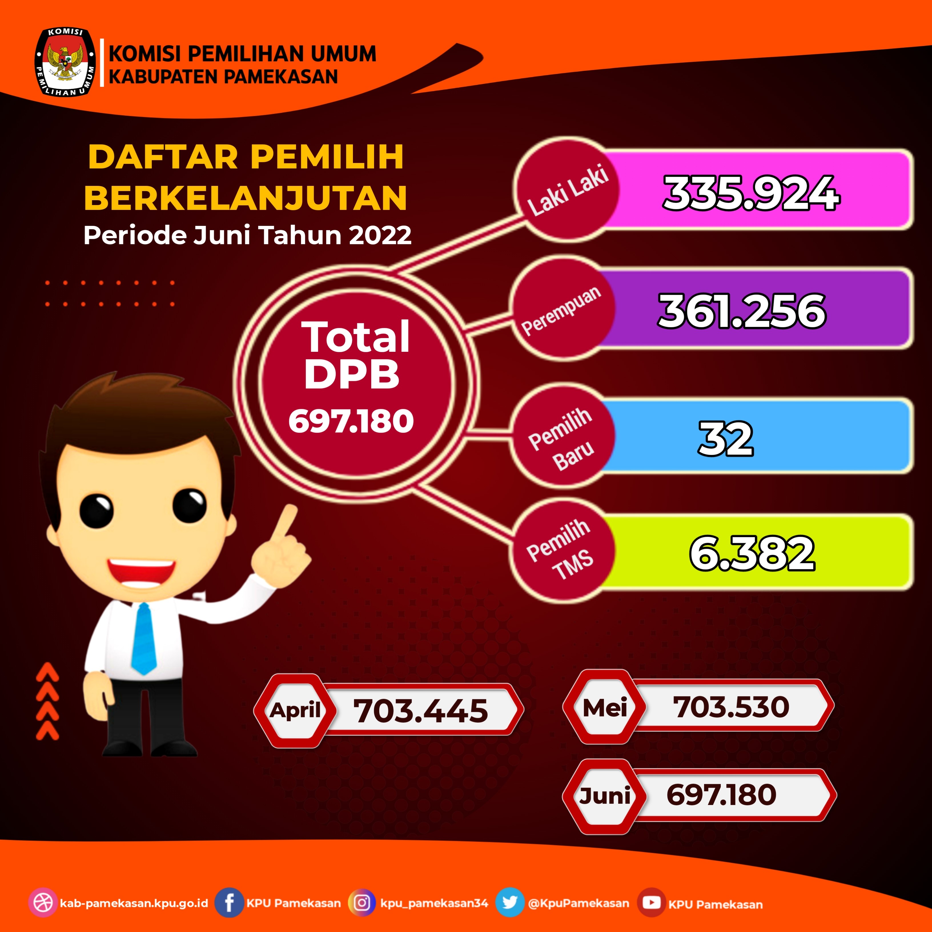 1. Rekapitulasi Daftar Pemilih Berkelanjutan Tahun 2022 Triwulan I dengan jumlah pemilih sebanyak 697.180 (enam ratus sembilan tujuh ribu seratus delapan puluh) dengan rincian pemilih-laki mencapai 335.924 (tiga ratus tiga puluh lima ribu sembilan ratus dua puluh empat) dan perempuan kembali 361.256 (tiga ratus enam puluh satu ribu dua ratus lima puluh enam), tersebar di 13 (tiga belas) Kecamatan, 189 (Seratus Delapan puluh Sembilan) Desa/Kelurahan.