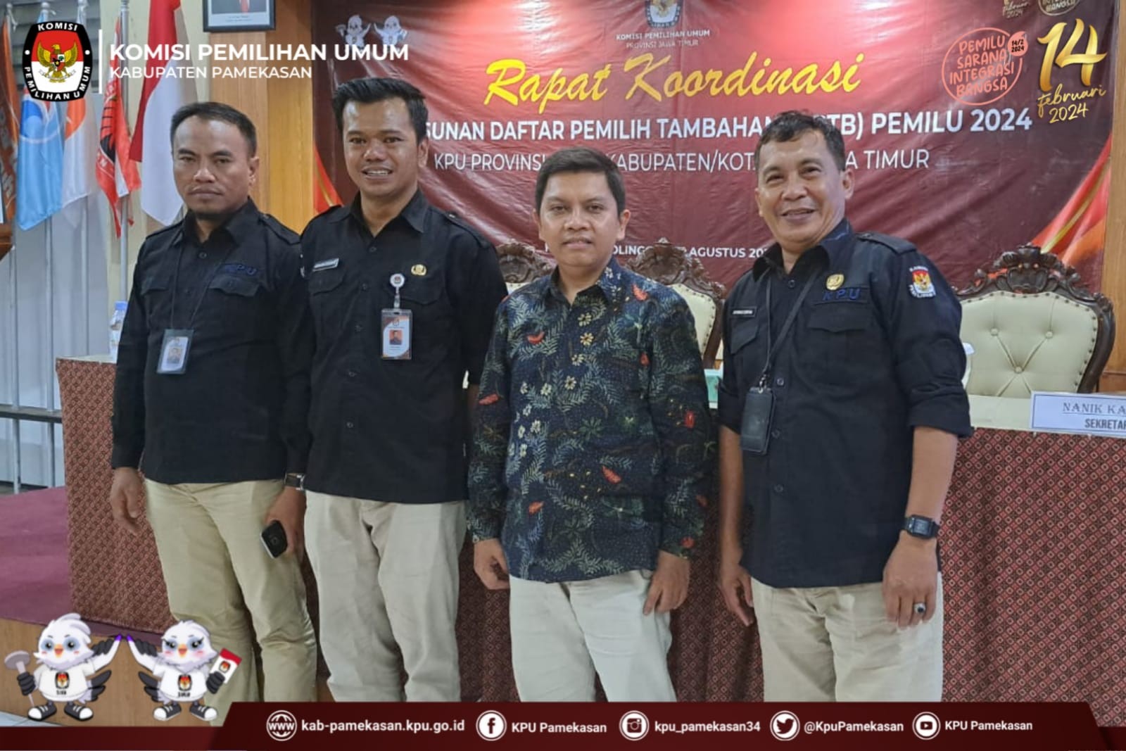 Proboliggo - kab-pamekasan.kpu.go.id - Komisi Pemilihan Umum (KPU) Kabupaten Pamekasan turut hadir dalam kegiatan Rapat Koordinasi (Rakor) Penyusunan Daftar Pemilih Tambahan (DPTb) Pemilihan Umum (Pemilu) 2024 bersama KPU Provinsi Jawa Timur dan KPU Kabupaten/Kota se-Jawa Timur Kegiatan bertempat di aula kantor KPU Kota Probolinggo, jalan Panglima Sudirman Nomor 514 Kota Probolinggo. Rabu-Kamis (2-3 Agustus 2023)