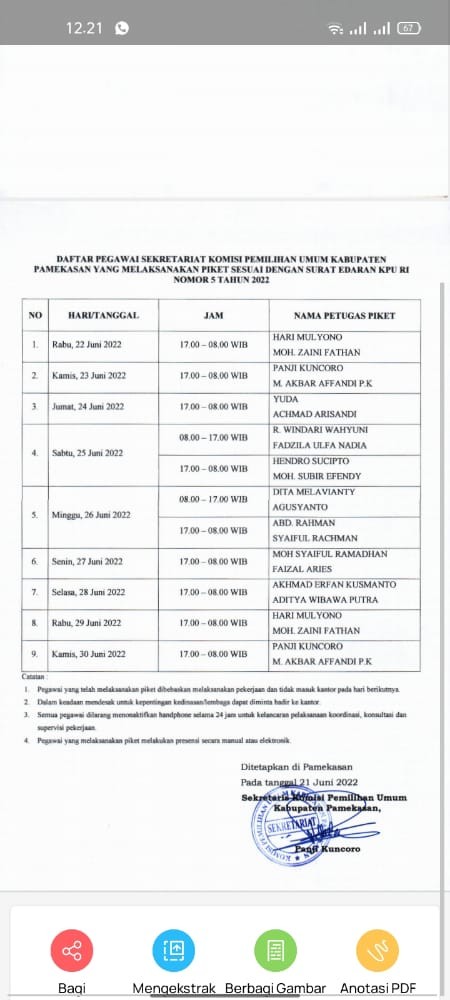Pamekasan - Dalam rangka mendukung kelancaran penyelenggaraan pemilu dan pemilihan serentak tahun 2024 sistem kerja pegawai di lingkungan sekretariat jenderal KPU, sekretariat KPU provinsi/KIP aceh dan sekretariat KPU/KIP kabupaten/kota, pada masa tahapan pemilu dan pemilihan serentak tahun 2024 diatur dengan ketentuan bahwa masing-masing unit kerja/satuan kerja menugaskan pegawai untuk melaksanakan piket dengan jumlah pegawai sekretariat jenderal KPU sebanyak 2 s.d 3 orang per unit eselon II. maka dari itu KPU Kabupaten Pamekasan memberlakukan peraturan piket pegawai 24 jam di mulai dari hari ini Rabu (22/6/22)