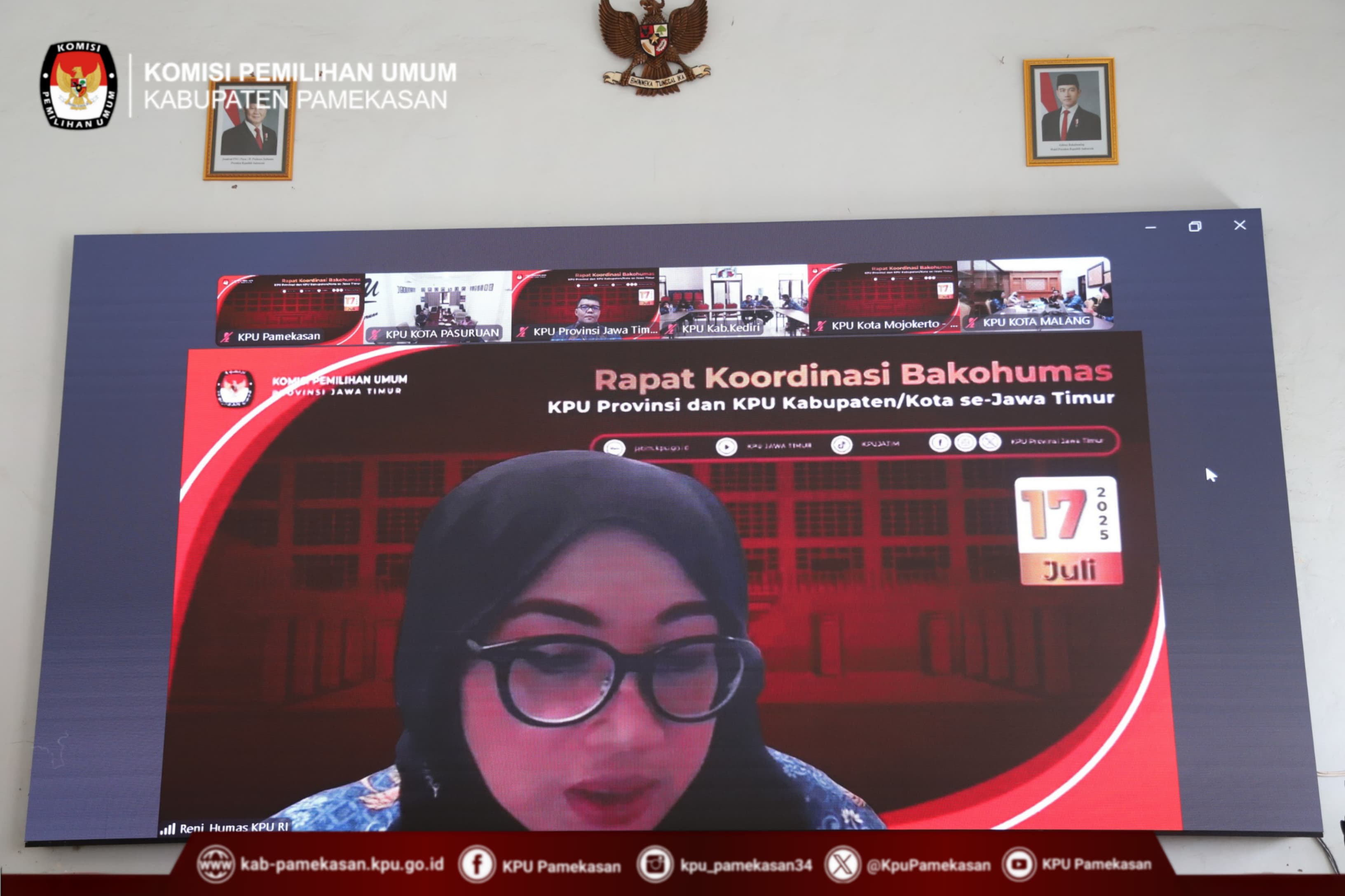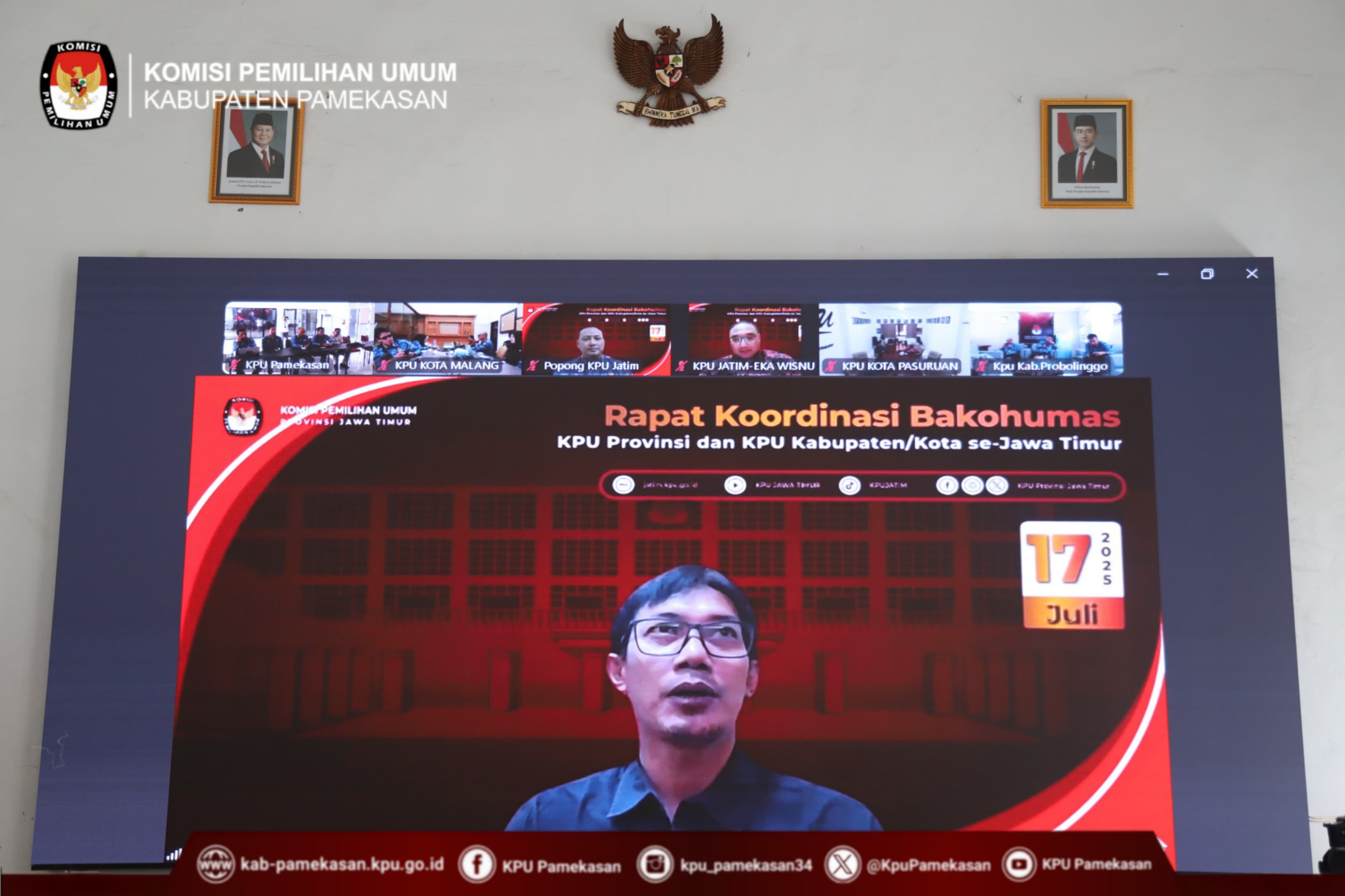 Pamekasan, 17 Juli 2025 – Komisi Pemilihan Umum (KPU) Kabupaten Pamekasan hari ini mengikuti Rapat Koordinasi (Rakor) Badan Koordinasi Hubungan Masyarakat (Bakohumas) KPU Provinsi dan KPU Kabupaten/Kota se-Jawa Timur secara daring. Rakor yang diselenggarakan oleh KPU Provinsi Jawa Timur ini bertujuan untuk meningkatkan efektivitas koordinasi, penguatan tata kelola kehumasan, serta kelancaran arus informasi antar satuan kerja dan koordinasi dengan instansi/lembaga terkait.