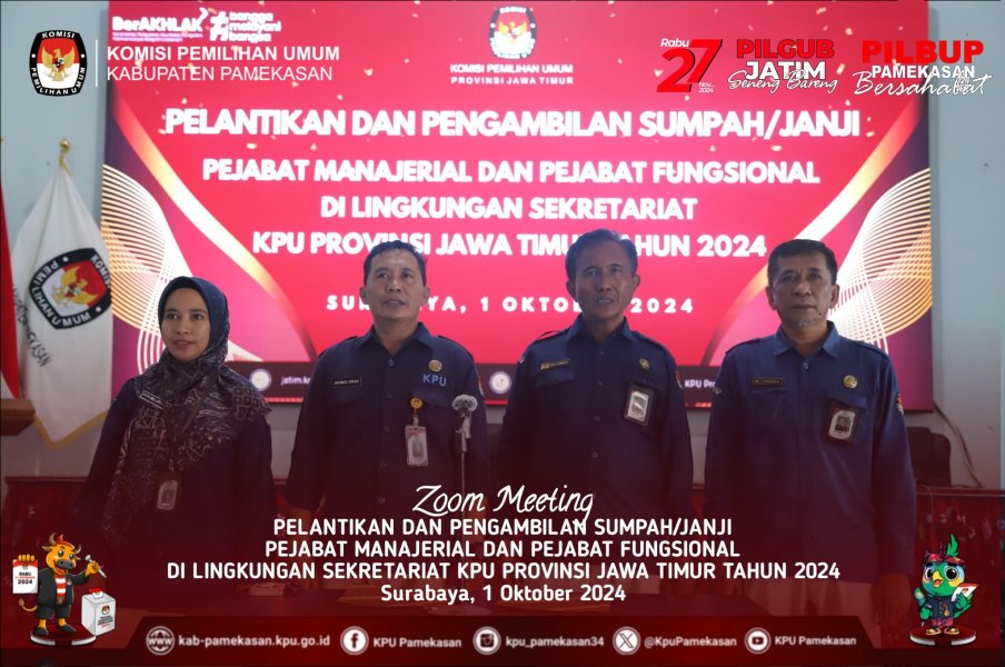 Pamekasan, 1 Oktober 2024 – Komisi Pemilihan Umum (KPU) Pamekasan hari ini mengikuti acara Pelantikan dan Pengambilan Sumpah/Janji Pejabat Manajerial dan Pejabat Fungsional di Lingkungan Sekretariat KPU Provinsi Jawa Timur Tahun 2024. Acara ini dilangsungkan secara virtual melalui Zoom Meeting pada Selasa, 1 Oktober 2024.