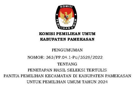 Berdasarkan Berita Acara Rapat Pleno KPU Kabupaten Pamekasan Nomor 65/PP.04.1-BA/3528/2022 tanggal 7 Desember 2022 tentang Hasil Seleksi Tertulis Calon Anggota Panitia Pemilihan Kecamatan (PPK) Pada Pemilihan Umum Tahun 2024, disampaikan hal-hal sebagai berikut: