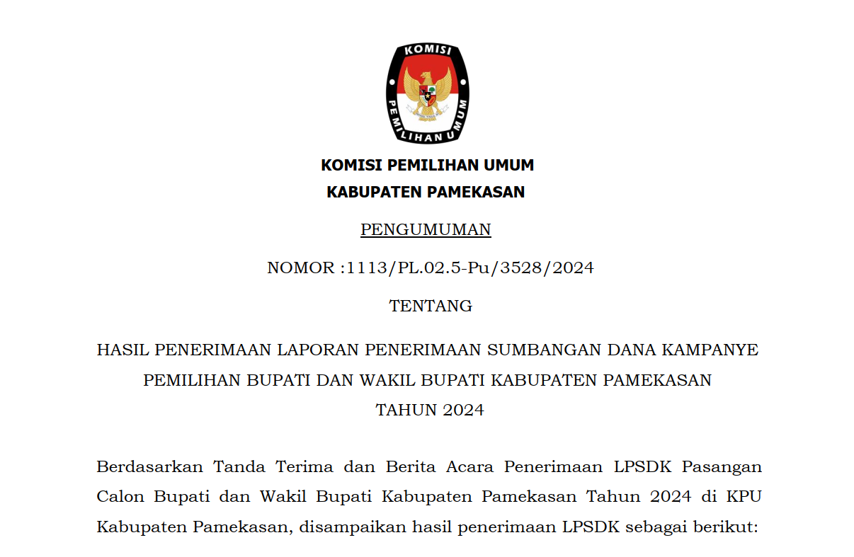 Pengumuman Hasil Penerimaan Laporan Penerimaan Sumbangan Dana Kampanye Pemilihan Bupati dan Wakil Bupati Pamekasan Tahun 2024