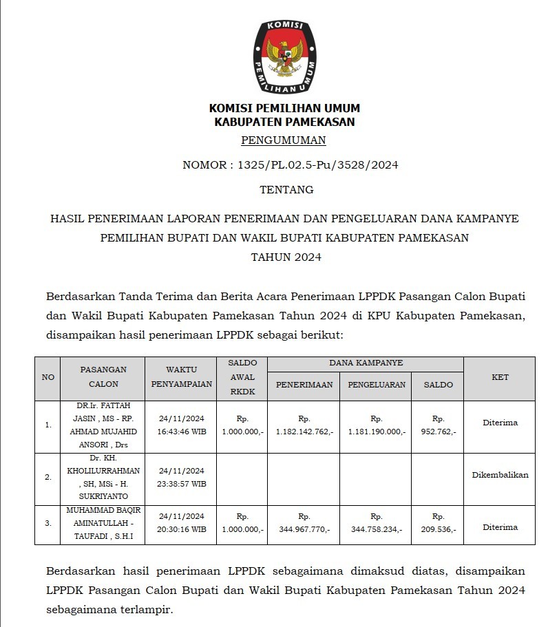 Berdasarkan Tanda Terima dan Berita Acara Penerimaan LPPDK Pasangan Calon Bupati dan Wakil Bupati Kabupaten Pamekasan Tahun 2024 di KPU Kabupaten Pamekasan, disampaikan hasil penerimaan LPPDK sebagai berikut:{Unduh Disini}