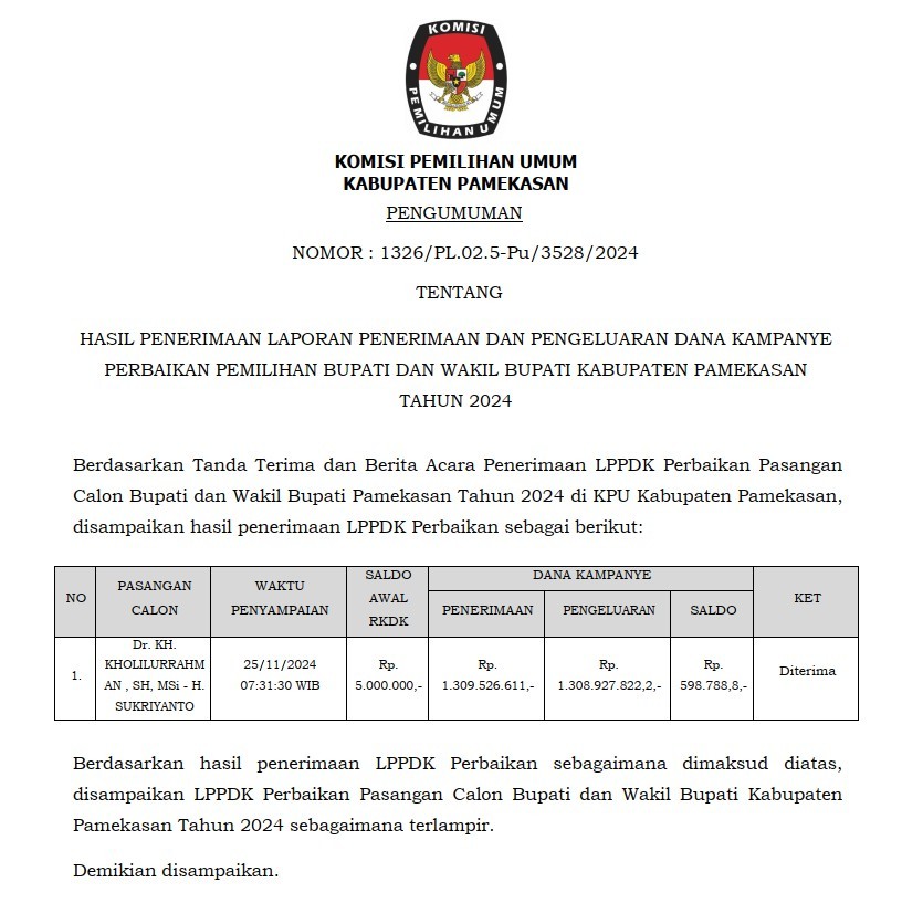 Berdasarkan Tanda Terima dan Berita Acara Penerimaan LPPDK Perbaikan Pasangan Calon Bupati dan Wakil Bupati Pamekasan Tahun 2024 di KPU Kabupaten Pamekasan, disampaikan hasil penerimaan LPPDK Perbaikan sebagai berikut: {Unduh Disini}