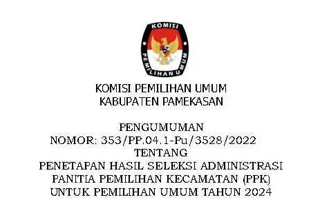 Berdasarkan Berita Acara Rapat Pleno KPU Kabupaten Pamekasan Nomor 63/PP.04.1-BA/3528/2022 tanggal 1 Desember 2022 tentang Hasil Penelitian Administrasi Calon Anggota Panitia Pemilihan Kecamatan (PPK) Pada Pemilu Tahun 2024, disampaikan hal-hal sebagai berikut: