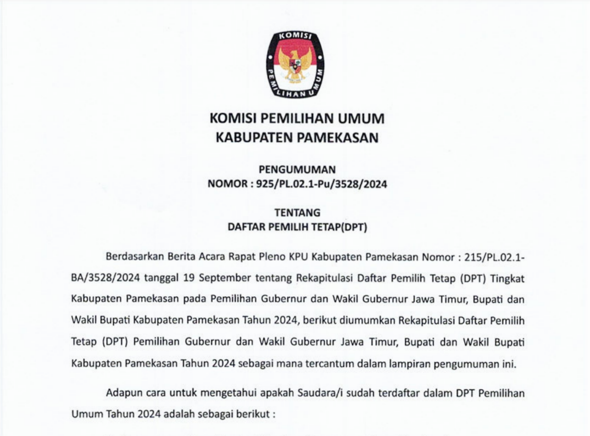 PENGUMUMAN PENETAPAN DAFTAR PEMILIH SEMENTARA (DPT) PILKADA PAMEKASAN TAHUN 2024