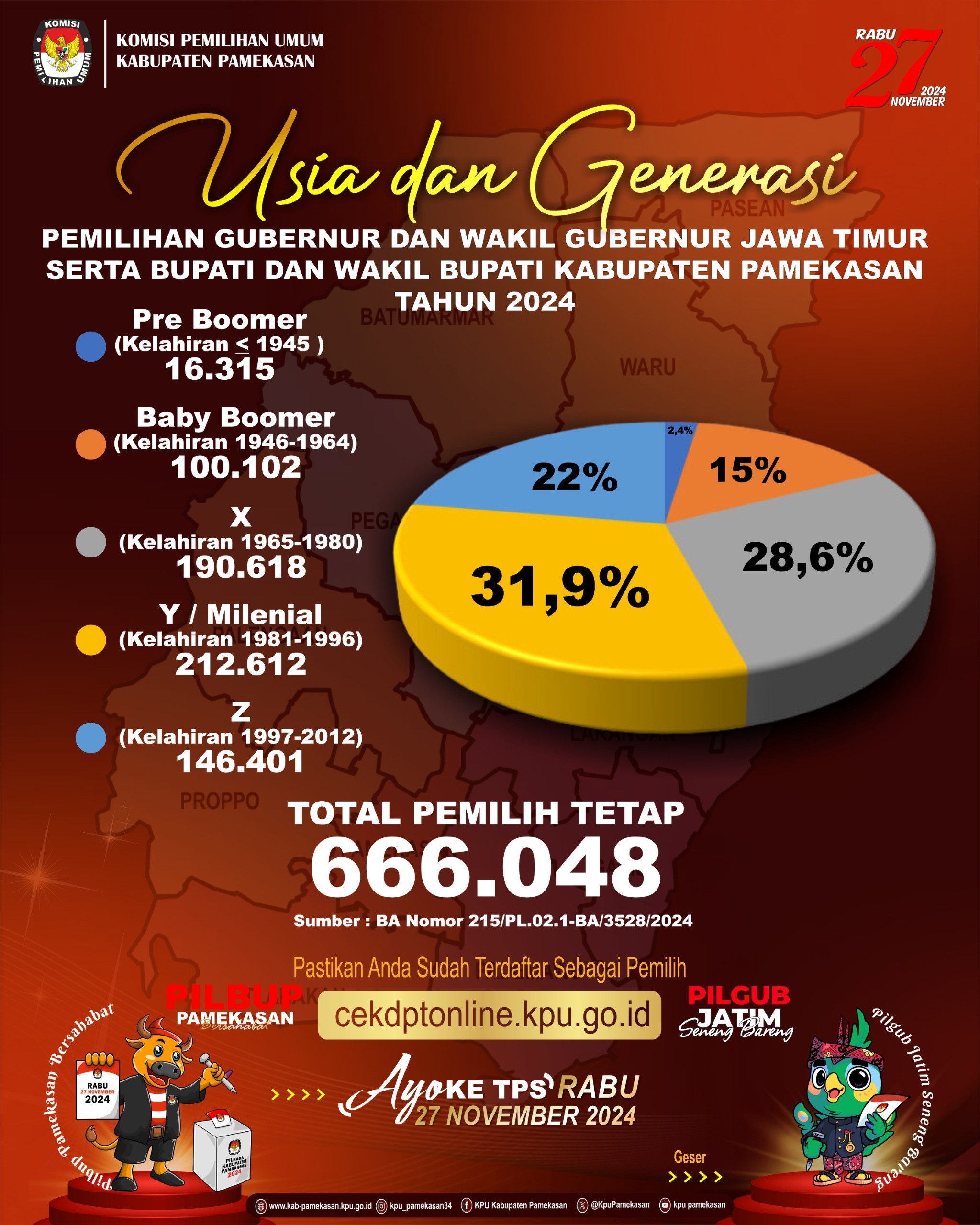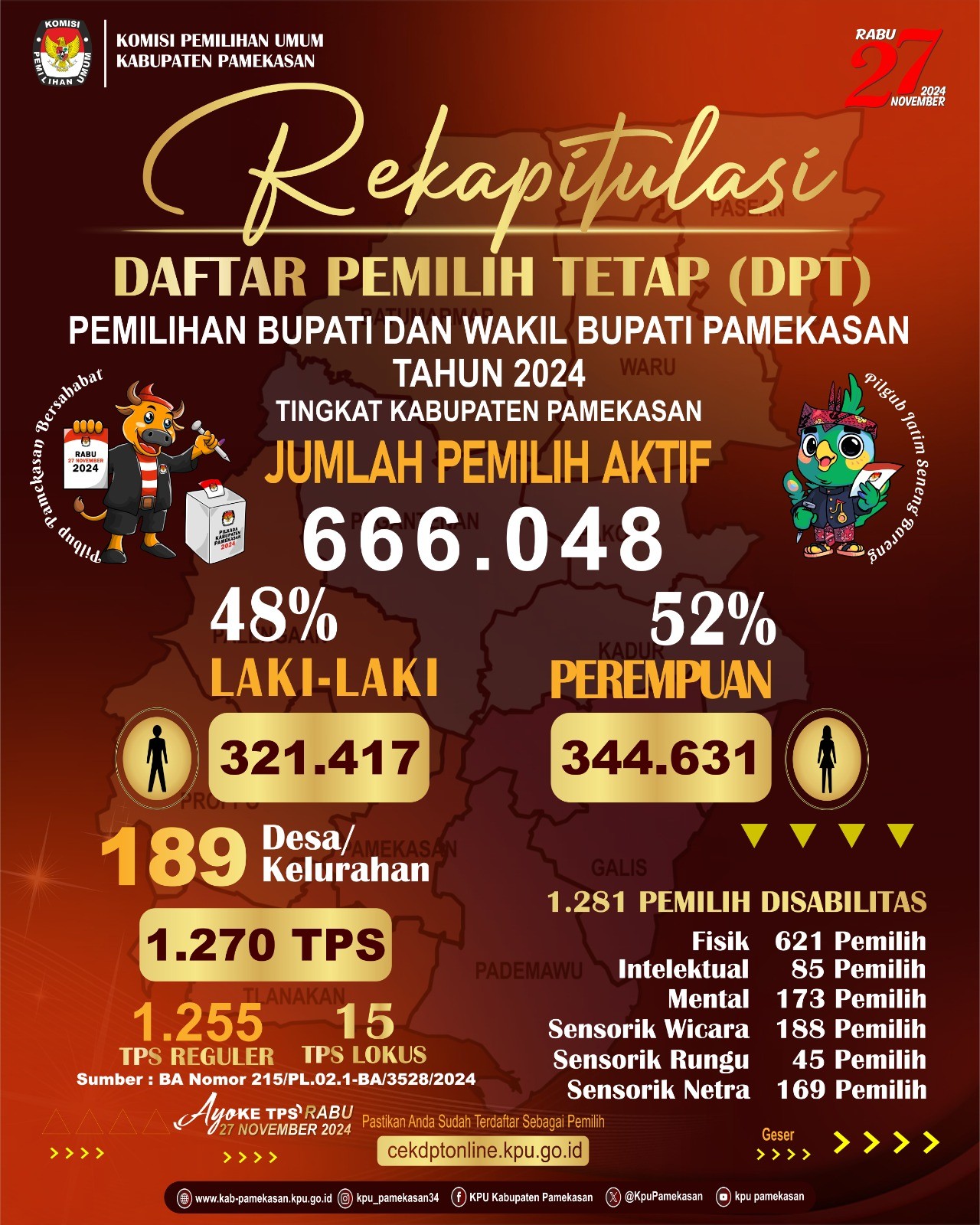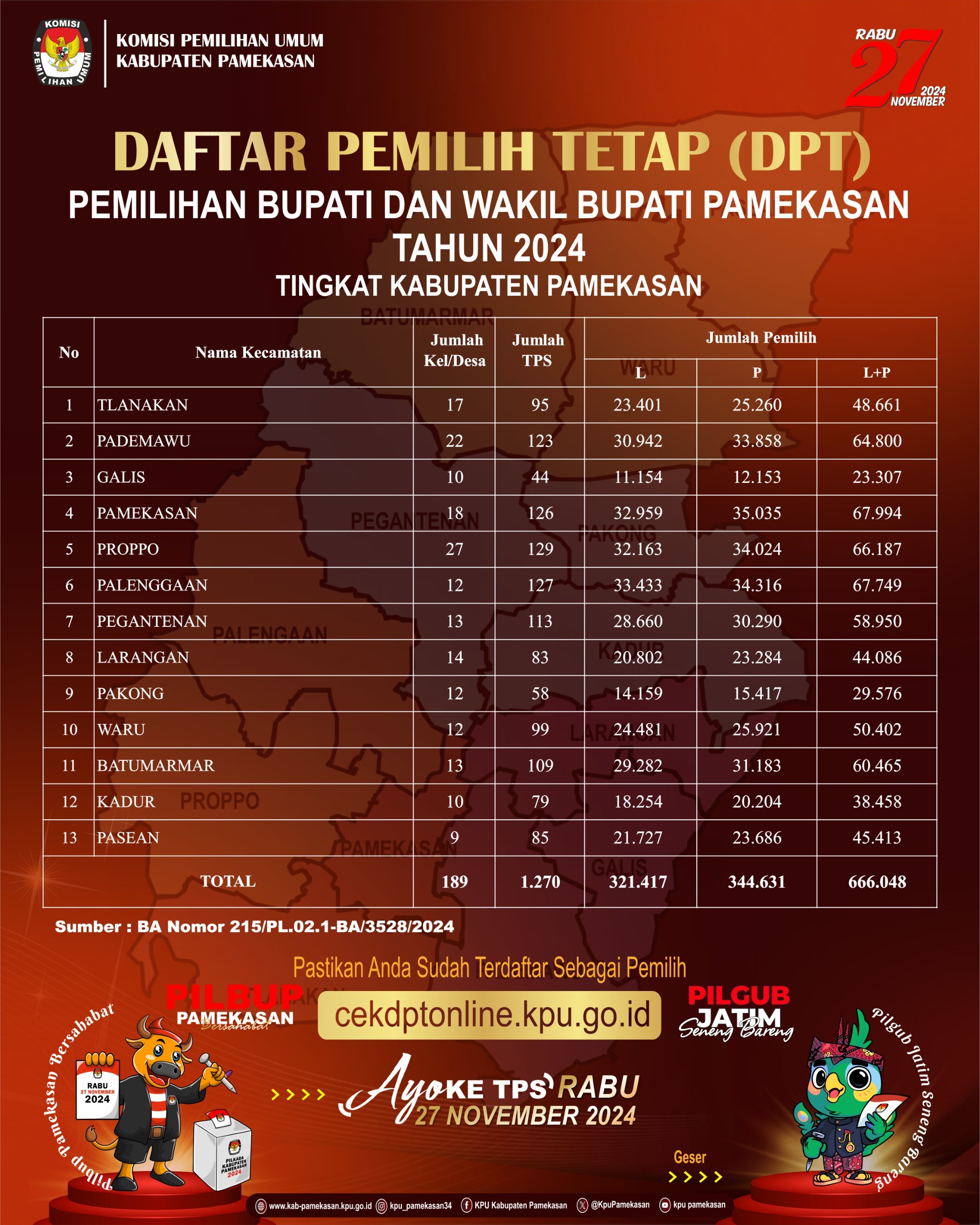 Berdasarkan Berita Acara Rapat Pleno KPU Kabupaten Pamekasan Nomor : 215/PL.02.1-BA/3528/2024 tanggal 19 September 2024 tentang Rekapitulasi Daftar Pemilih Tetap (DPT) Tingkat Kabupaten Pamekasan pada Pemilihan Gubernur dan Wakil Gubernur Jawa Timur serta Bupati dan Wakil Bupati Kabupaten Pamekasan Tahun 2024, berikut diumumkan Rekapitulasi Daftar Pemilih Sementara (DPT) Pemilihan Gubernur dan Wakil Gubernur Jawa Timur serta Bupati dan Wakil Bupati Kabupaten Pamekasan Tahun 2024 sebagaimana tercantum dalam lampiran pengumuman ini.