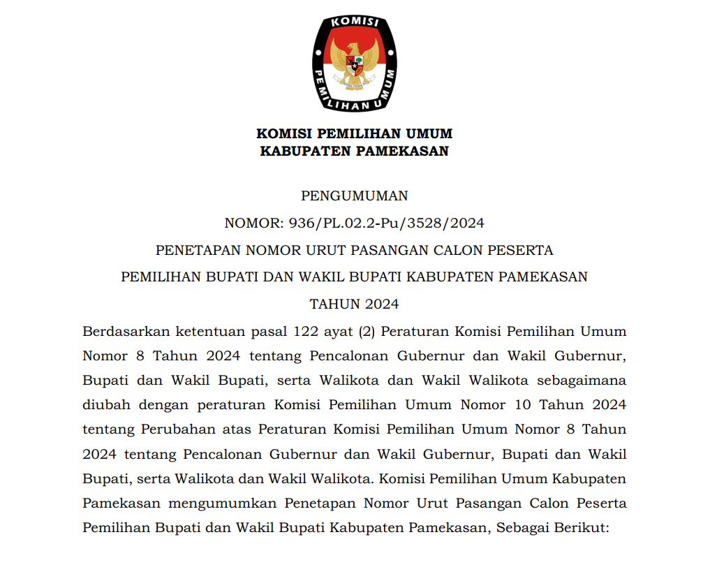 Berdasarkan ketentuan pasal 122 ayat (2) Peraturan Komisi Pemilihan Umum Nomor 8 Tahun 2024 tentang Pencalonan Gubernur dan Wakil Gubernur, Bupati dan Wakil Bupati, serta Walikota dan Wakil Walikota sebagaimana diubah dengan peraturan Komisi Pemilihan Umum Nomor 10 Tahun 2024 tentang Perubahan atas Peraturan Komisi Pemilihan Umum Nomor 8 Tahun 2024 tentang Pencalonan Gubernur dan Wakil Gubernur, Bupati dan Wakil Bupati, serta Walikota dan Wakil Walikota. Komisi Pemilihan Umum Kabupaten Pamekasan mengumumkan Penetapan Nomor Urut Pasangan Calon Peserta Pemilihan Bupati dan Wakil Bupati Kabupaten Pamekasan, Sebagai Berikut: