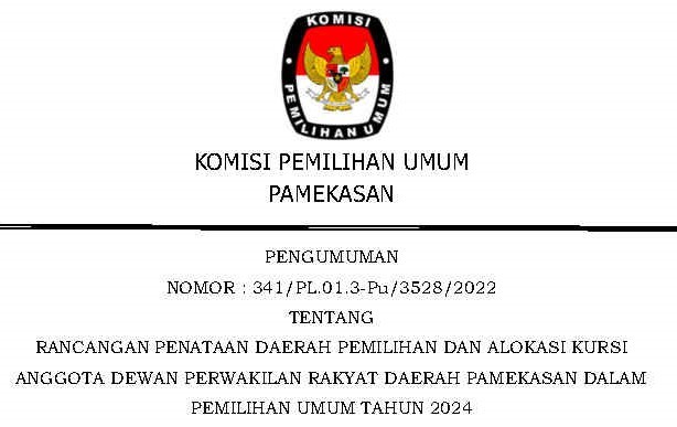 Pengumuman Rancangan Penataan Daerah Pemilihan dan Alokasi Kursi Anggota Dewan Perwakilan Rakyat Daerah Kabupaten Pamekasan dalam Pemilihan Umum Tahun 2024