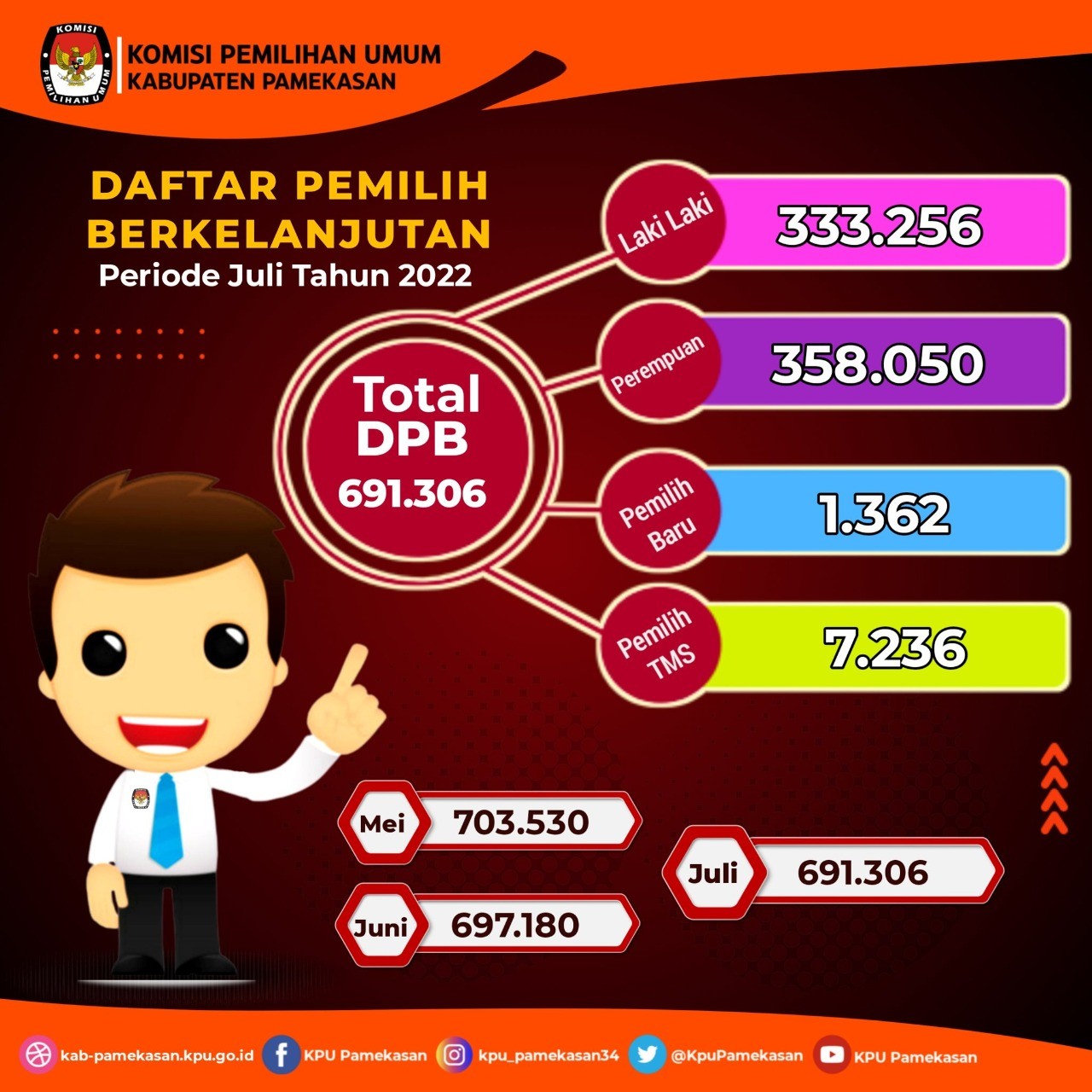 Berdasarkan ketentuan Peraturan Komisi Pemilihan Umum Nomor 6 Tahun 2021 tentang Pemutakhiran Data Pemilih Berkelanjutan, hasil Rapat Koordinasi yang dilakukan oleh KPU Kabupaten Pamekasan telah melakukan Rekapitulasi Daftar Pemilih Berkelanjutan Tahun 2022 periode bulan Juli dengan jumlah pemilih sebanyak 691.306 (enam ratus sembilan puluh satu ribu tiga ratus enam) dengan rincian pemilih laki-laki berjumlah 333.256 (tiga ratus tiga puluh tiga ribu dua ratus lima puluh enam) dan pemilih perempuan berjumlah 358.050 (tiga ratus lima puluh delapan ribu lima puluh), tersebar di 13 (tiga belas) Kecamatan, 189 (Seratus delapan puluh Sembilan) Desa/Kelurahan.