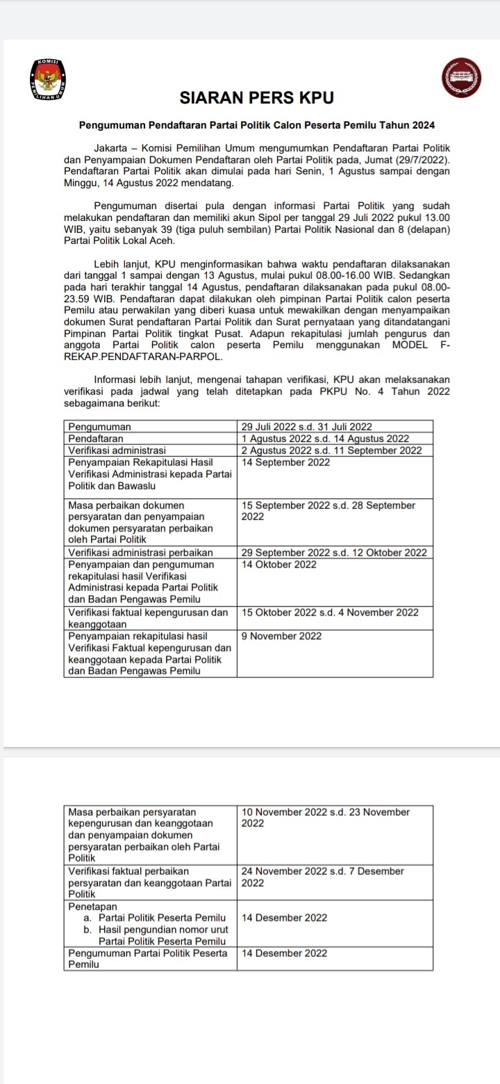 Jakarta – Komisi Pemilihan Umum mengumumkan Pendaftaran Partai Politik dan Penyampaian Dokumen Pendaftaran oleh Partai Politik pada, Jumat (29/7/2022). Pendaftaran Partai Politik akan dimulai pada hari Senin, 1 Agustus sampai dengan Minggu, 14 Agustus 2022 mendatang. Rilis selengkapnya dapat di Unduh disini.