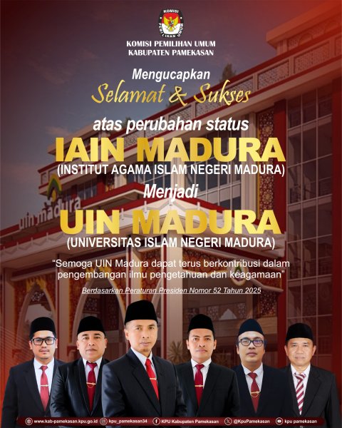 Pamekasan, 26 Mei 2025 – Komisi Pemilihan Umum (KPU) Kabupaten Pamekasan menyambut gembira dan memberikan apresiasi tinggi atas perubahan status Institut Agama Islam Negeri (IAIN) Madura menjadi Universitas Islam Negeri (UIN) Madura. Peresmian status baru ini ditandai dengan penyerahan Surat Keputusan (SK) Presiden dari Menteri Agama Republik Indonesia kepada Rektor UIN Madura pada hari ini, Senin (26/05/2025). Ketua KPU Pamekasan, Mahdi, dalam keterangannya menyatakan bahwa perubahan status ini merupakan tonggak sejarah penting bagi dunia pendidikan di Madura, khususnya Pamekasan. "Kami sangat bersyukur dan bangga IAIN Madura kini telah resmi menjadi UIN Madura. Ini adalah kabar baik yang telah lama dinantikan oleh seluruh elemen masyarakat Madura," ujar Mahdi. Menurut Mahdi, peningkatan status menjadi universitas akan membuka lebih banyak peluang bagi pengembangan keilmuan, penelitian, dan pengabdian kepada masyarakat. "Dengan status universitas, diharapkan UIN Madura dapat semakin berkembang, tidak hanya dalam bidang ilmu keagamaan, tetapi juga dalam berbagai disiplin ilmu lainnya yang relevan dengan kebutuhan zaman," tambahnya. Lebih lanjut, Ketua KPU Pamekasan juga menyoroti potensi besar UIN Madura dalam memberikan kontribusi positif terhadap peningkatan kualitas demokrasi di wilayah tersebut. "Sebagai institusi pendidikan tinggi, UIN Madura memiliki peran strategis dalam mencetak generasi muda yang cerdas, kritis, dan berintegritas. Ini tentu akan berdampak positif pada partisipasi politik dan kualitas demokrasi di Pamekasan dan Madura secara keseluruhan," jelasnya. KPU Pamekasan berharap, dengan status baru ini, UIN Madura dapat terus berinovasi dan menjadi pusat keunggulan pendidikan yang mampu bersaing di tingkat nasional maupun internasional. "Kami siap menjalin sinergi dan kolaborasi dengan UIN Madura dalam berbagai program yang berkaitan dengan pendidikan politik dan peningkatan kesadaran demokrasi di kalangan mahasiswa dan civitas akademika," pungkas Ketua KPU Pamekasan. Perubahan status ini diharapkan menjadi awal baru bagi UIN Madura untuk semakin maju dan memberikan dampak yang lebih luas bagi kemajuan pendidikan, kebudayaan, dan pembangunan di Pulau Madura.