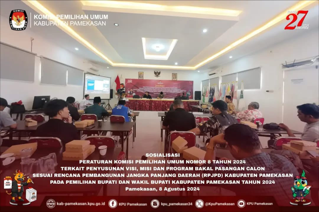 Untuk diketahui bersama Tujuan Kegiatan Sosialisasi ini yakni memberikan pemahaman yang seluas-luasnya kepada semua pihak berdasarkan PKPU Nomor 8 Tahun 2024 tentang Pencalonan Gubernur dan Wakil Gubernur, Bupati dan Wakil Bupati Serta Walikota dan Wakil Walikota disertai penyusunan Visi, Misi dan Program Bakal Pasangan Calon sesuai Rencana Pembangunan Jangka Panjang Daerah (RPJPD).
