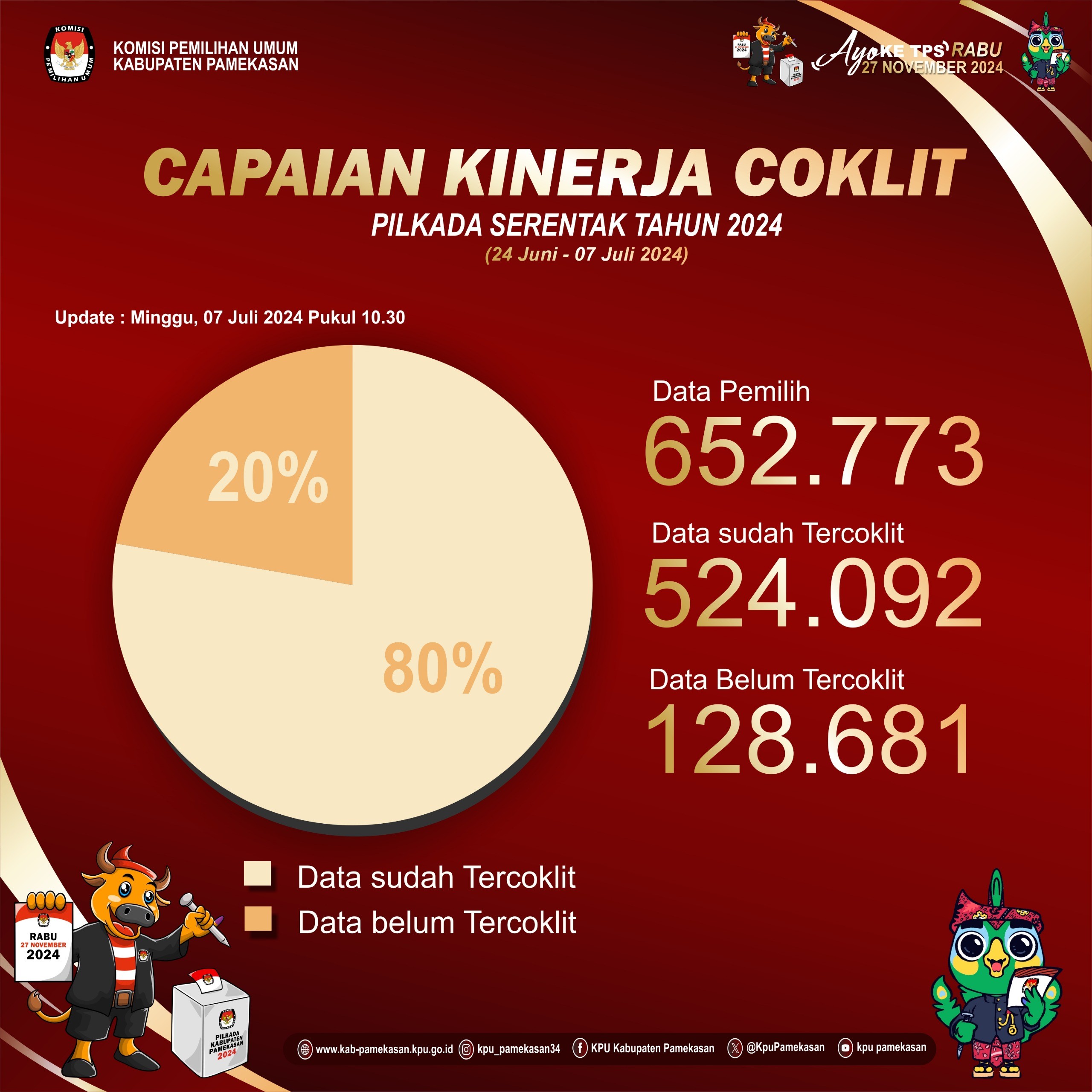 Pamekasan, kab-pamekasan.kpu.go.id – Komisi Pemilihan Umum (KPU) Kabupaten Pamekasan hari ini Sabtu 4 Juli 2024 melakukan Monitoring dan Evaluasi Pelaksanaan Pencocokan dan Penelitian untuk Pemilihan Gubernur dan Wakil Gubernur Jawa Timur serta Bupati dan Wakil Bupati Kabupaten Pamekasan Tahun 2024 di Kecamatan Pademawu. Tim monitoring KPU Kabupaten Pamekasan ke Desa Bunder, Desa Tanjung, dan Desa Pademawu Barat dipimpin Anggota KPU Kabupaten Kendal Divisi Perencanaan, Data, dan Informasi Mohammad Halili didampingi beberapa staf Sekretariat KPU Kabupaten Pamekasan. Halili menyampaikan apresiasi atas kerja keras Pantarlih Desa Bunder, Desa Tanjung, dan Desa Pademawu Barat yang telah melaksanakan coklit selama beberapa minggu ini dan meminta kepada Pantarlih Desa Bunder, Desa Tanjung, dan Desa Pademawu Barat untuk tetap mendata dengan jujur dan apa adanya. "Jangan ada istilah ditembak dari rumah", guraunya kepada Pantalih. Dia menginginkan setelah selesai pencoklitan, Pantarlih menempelkan stiker sebagai bukti sudah melaksanakan pencoklitan dengan terlebih dahulu meminta izin kepada pemilik rumah. Di lain pihak dia mengharapkan pihak PPS, Sekretariat PPS dan Pantarlih Desa Bunder, Desa Tanjung, dan Desa Pademawu Barat, tidak memberikan data pemilih kepada sembarang orang, karena data pemilih untuk Pemilu adalah ranah KPU RI yang nantinya dapat diakses melalui aplikasi SiDalih. "Jangan sampai memberi data seperti DP4 kepada sembarang orang", pintanya. Di akhir monitoring, tim KPU Kabupaten Pamekasan melakukan wawancara kinerja coklit kepada beberapa orang Pantarlih Desa Bunder, Desa Tanjung, dan Desa Pademawu Barat dan melakukan uji petik hasil coklit ke salah satu warga di desa tersebut.