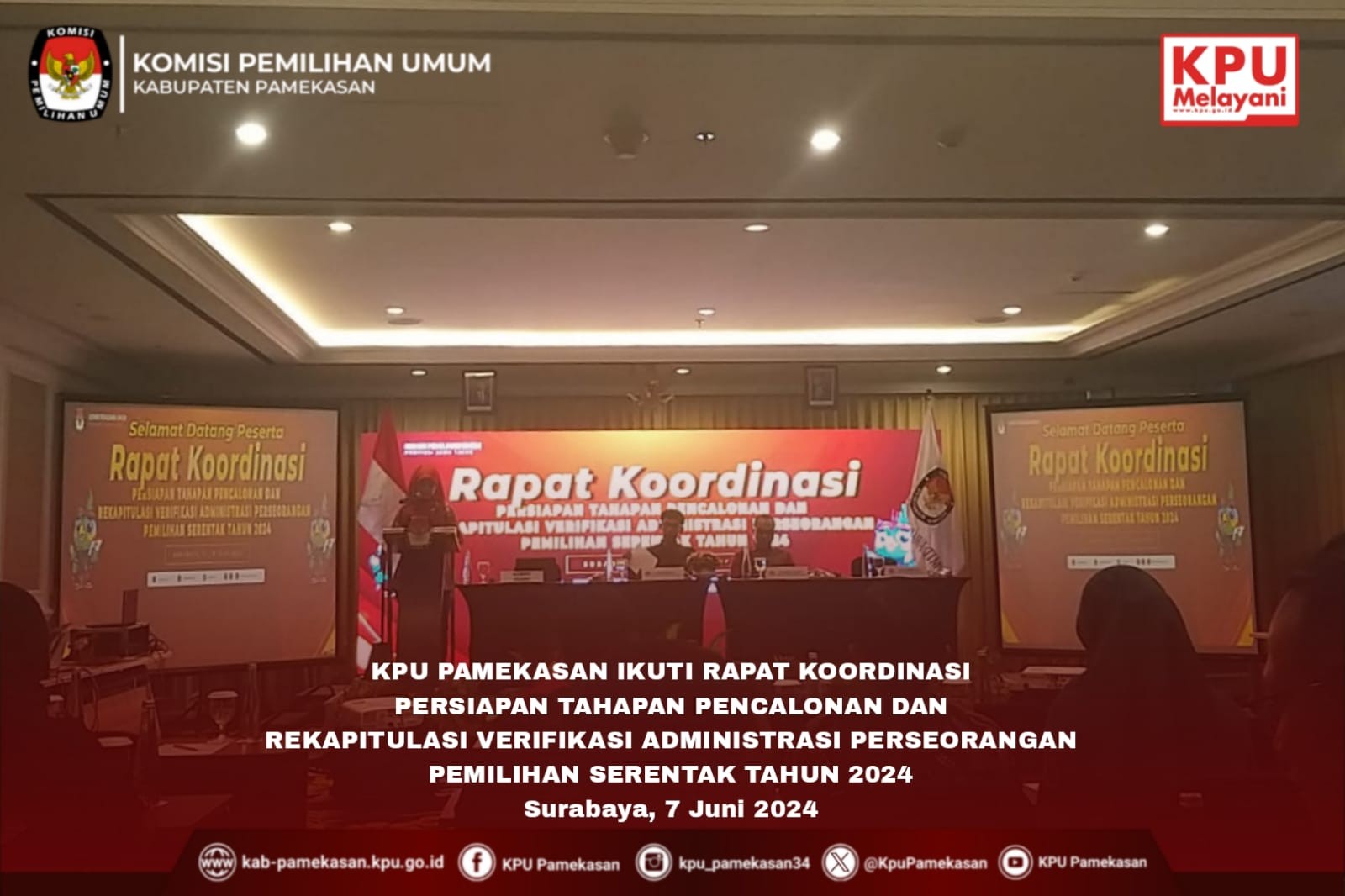 Surabaya, kab-pamekasan.kpu.go.id - KPU Pamekasan Hadiri Persiapan Tahapan Pencalonan dan Rekapitulasi Verifikasi Administrasi Perseorangan Pemilihan Serentak Tahun 2024, berlangsung pada Jumat-Sabtu, 7-8 Juni 2024, mulai pukul 15.00 WIB - selesai. Bertempat di Oakwood Hotel & Residence, Jl. Raya Kertajaya Indah Nomor 79 Surabaya.
