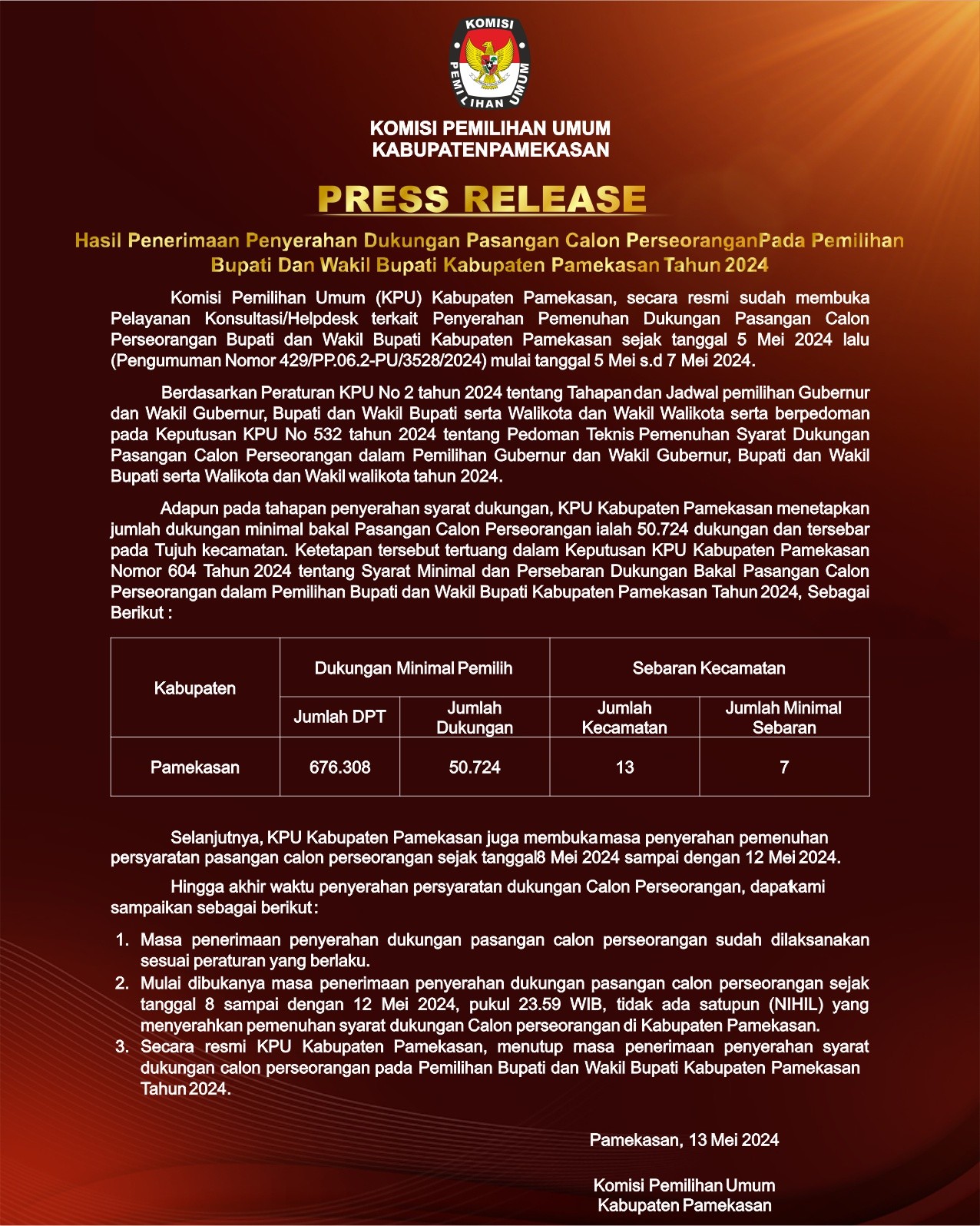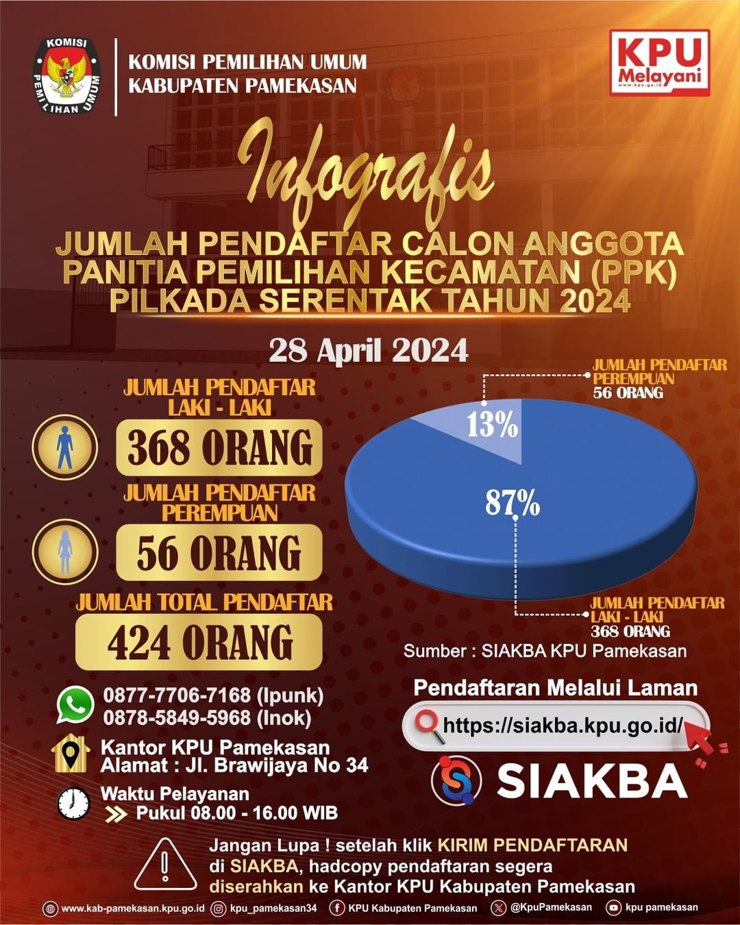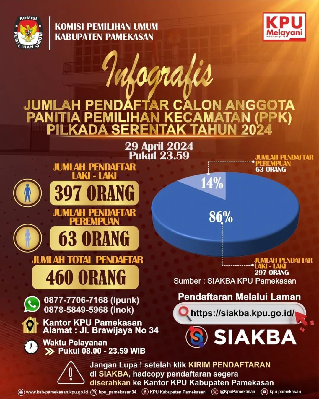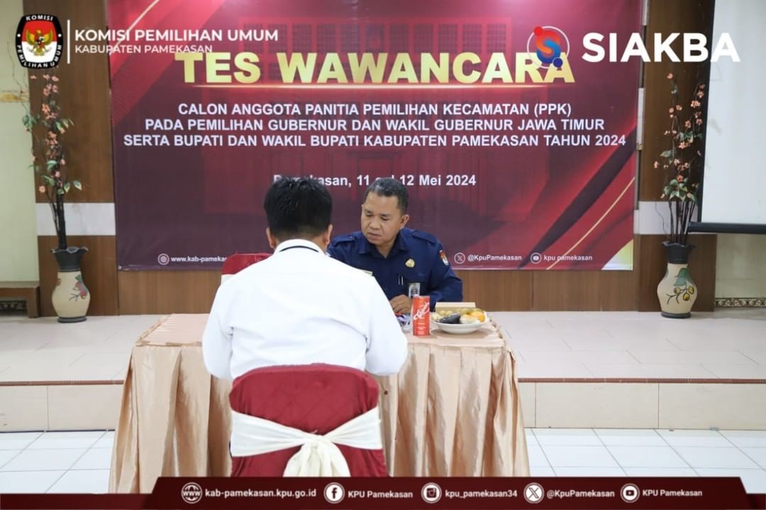Pamekasan, kab-pamekasan.kpu.go.id - Perekrutan penyelenggara Pemilihan Gubernur dan Wakil Gubernur, Serta Bupati dan Wakil Bupati Pamekasan Tahun 2024 di tingkat kecamatan sudah hampir memasuki babak akhir. Pasalnya, mulai hari ini (Sabtu, 11 Mei) sampai besok (Minggu, 12 Mei) KPU Pamekasan menggelar tes wawancara bagi para calon PPK. Tempat pelaksanaan tes dilaksanakan di Gedung PKP-RI Jalan Kemuning Pamekasan. Tiap Kecamatan durasi waktu yang disediakan sama semua yaitu satu jam. Moh. Halili Ketua KPU Pamekasan mengatakan, pelaksanaan tes wawancara bagi calon PPK dibagi menjadi dua gelombang. Gelombang pertama hari Sabtu, 11 Mei mulai jam 08.00 sampai jam 17.00 wib. Pada gelombang pertama ini terdapat 8 kecamatan yang akan dilakukan tes wawancara. Karena waktunya sampai sore hari maka siang harinya ada waktu ishoma. "Sementara gelombang kedua adalah hari Minggu, 12 Mei. Hanya 5 kecamatan yang akan tes wawancara. Sehingga waktunya sampai jam 13.00 wib," kata Halili, Ketua KPU Pamekasan Jumlah PPK yang dibutuhkan di Kabupaten yang punya tagline Pamekasan Hebat dan punya motto Berteman ini adalah 65 orang. Dimana tiap kecamatan berjumlah 5 anggota PPK.