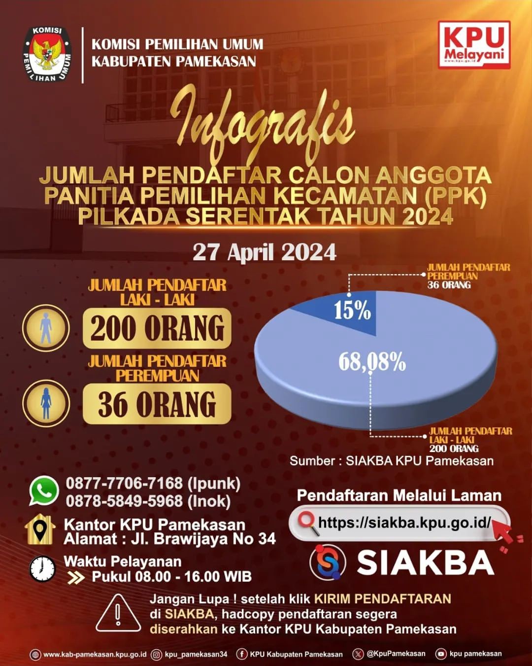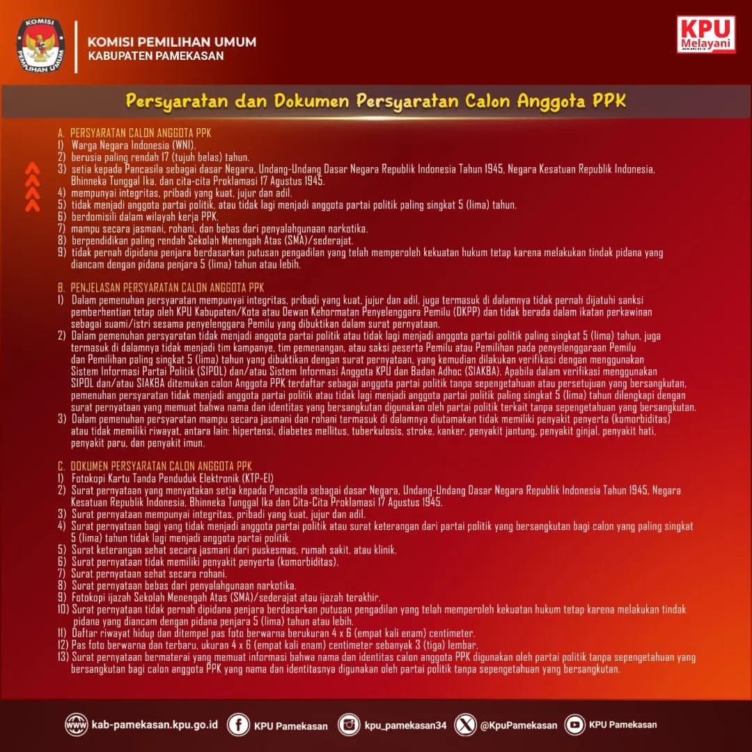 Persyaratan Anggota PPK: a. Warga Negara Indonesia; b. berusia paling rendah 17 (tujuh belas) tahun; c. setia kepada Pancasila sebagai dasar Negara, Undang-Undang Dasar Negara Republik Indonesia Tahun 1945, Negara Kesatuan Republik Indonesia, Bhinneka Tunggal Ika, dan cita-cita Proklamasi 17 Agustus 1945; d. mempunyai integritas, pribadi yang kuat, jujur dan adil; e. tidak menjadi anggota Partai Politik yang dinyatakan dengan surat pernyataan yang sah, atau sekurang-kurangnya 5 (lima) tahun tidak lagi menjadi anggota partai politik yang dibuktikan dengan surat keterangan dari pengurus partai politik yang bersangkutan; f. berdomisili dalam wilayah kerja PPK; g. mampu secara jasmani, rohani, dan bebas dari penyalahgunaan narkotika; h. berpendidikan paling rendah sekolah menengah atas atau sederajat; dan i. tidak pernah dipidana penjara berdasarkan putusan pengadilan yang telah memeroleh kekuatan hukum tetap karena melakukan tindak pidana yang diancam dengan pidana penjara 5 (lima) tahun atau lebih. Kelengkapan Dokumen Persyaratan: a. Surat pendaftaran sebagai calon anggota PPK; b. Fotokopi Kartu Tanda Penduduk Elektronik sebanyak 1 (satu) lembar; c. Fotokopi ijazah sekolah menengah atas/sederajat atau ijazah terakhir sebanyak 1 (satu) lembar; d. Surat pernyataan dalam satu dokumen yang menyatakan : 1. setia kepada Pancasila sebagai dasar Negara, Undang-Undang Dasar Negara Republik Indonesia Tahun 1945, Negara Kesatuan Republik Indonesia, Bhinneka Tunggal Ika, dan cita-cita Proklamasi 17 Agustus 1945; 2. tidak menjadi anggota Partai Politik; 3. bebas dari penyalahgunaan narkotika; 4. tidak pernah dipidana penjara berdasarkan putusan pengadilan yang telah memeroleh kekuatan hukum tetap karena melakukan tindak pidana yang diancam dengan pidana penjara 5 (lima) tahun atau lebih; 5. tidak pernah dijatuhi sanksi pemberhentian tetap oleh KPU Kabupaten/Kota atau Dewan Kehormatan Penyelenggara Pemilu; 6. tidak menjadi tim kampanye atau tim pemenangan atau saksi peserta Pemilu atau Pemilihan pada penyelenggaraan Pemilu dan Pemilihan paling singkat dalam 5 (lima) tahun terakhir; 7. tidak berada dalam ikatan perkawinan dengan sesama penyelenggara Pemilu; 8. tidak memiliki penyakit penyerta (komorbiditas); 9. mempunyai kemampuan dan kecakapan dalam membaca, menulis dan berhitung; dan 10. mampu mengoperasikan perangkat teknologi informasi. e. Surat keterangan dari partai politik yang bersangkutan bagi calon yang paling singkat 5 (lima) tahun tidak lagi menjadi anggota Partai Politik; f. Surat keterangan sehat jasmani dan rohani yang dikeluarkan oleh puskesmas, rumah sakit, atau klinik yang termasuk di dalamnya terdapat pemeriksaan tekanan darah, kadar gula darah, dan kolesterol; g. Daftar Riwayat Hidup; dan h. Pas Foto Berwarna 4x6 sebanyak 1 (satu) lembar. Surat Pendaftaran dan kelengkapan dokumen persyaratan disampaikan kepada KPU Kabupaten Pamekasan sejak tanggal 23 April2024 sampai dengan tanggal 29 April 2024 Pukul 16.00 WIB, melalui: a. siakba.kpu.go.id dan dokumen fisik disampaikan kepada KPU Kabupaten Pamekasan pada saat sebelum pelaksanaan seleksi tertulis; atau b. Petugas Pendaftaran di Kantor Sekretariat KPU Kabupaten Pamekasan mulai pukul 08.00 WIB sampai dengan 16.00 WIB. Alamat : Jalan Brawijaya 34 Kontak : 0878-5849-5968 (Inok) 1. SURAT PENDAFTARAN unduh disini 2. SURAT PERNYATAAN unduh disini 3. DAFTAR RIWAYAT HIDUP unduh disini