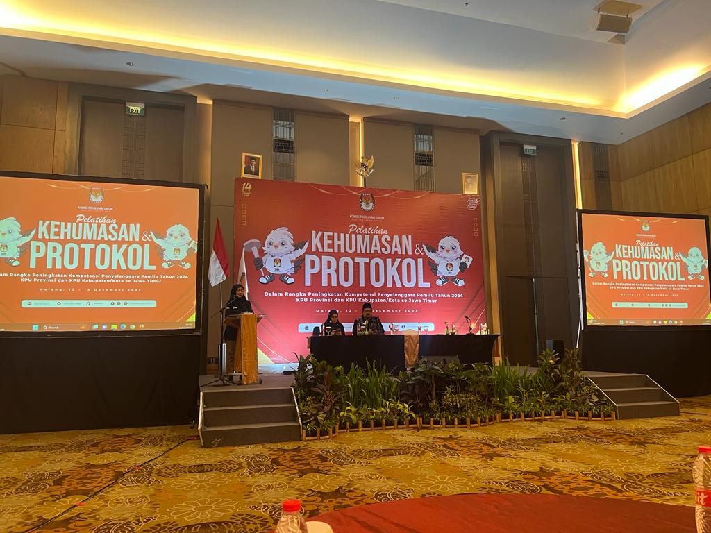 Malang, kab-pamekasan.kpu.go.id - Komisi Pemilihan Umum (KPU) Kabupaten Pamekasan Ikuti Pelatihan Kehumasan dan Protokol dalam rangka Peningkatan Kompetensi Penyelenggara Pemilu Tahun 2024. Selasa, (12/12/2023). Bertempat di Harris Hotels Malang. Rangkaian pembukaan berlangsung sedari pukul 14.00 WIB dan dihadiri oleh Anggota KPU Jawa Timur (Jatim) Gogot Cahyo Baskoro beserta sekretariat terkait serta Anggota ketua divisi Sosdiklih, Parmas dan SDM dan juga 2 orang Sekretariat KPU Kabupaten/Kota yang membidangi Humas dan Protokol se-Jawa Timur, Anggota KPU Kabupaten Pamekasan, Fathor Rachman divisi Sosdiklih, Parmas dan SDM, R. Windari Wahyuni, dan M. Subir Efendi Hadir mewakili KPU Kabupaten Pamekasan. Dalam sambutannya Gogot Cahyo Baskoro menyampaikan jika pelatihan ini dapat dihadiri oleh siapapun pada kesekretariatan KPU. "Siapapun strukturnya selama mampu dan dapat menjalankan tugas itu yang kita undang" ujar gogot. Tak hanya itu, pada kegiatan ini KPU Jatim mendatangkan Event Organizer ternama di Jatim yakni dari WePro Communication. Gogot menyampaikan jika pelatihan ini diadakan guna mangajak sekretariat KPU yang membidangi untuk bersama-sama belajar. "Ini adalah pelajaran untuk teman-teman semua supaya memiliki Public Speaking yang bagus, serta dapat melakukan teknik untuk membangkitkan suasana" terang gogot. Adapun materi yang di terangkan, mulai dari Materi dan Praktek Public Speaking Kehumasan, Keprotokolan dan MC Formal, serta Praktik Service Excellence dan Grooming.