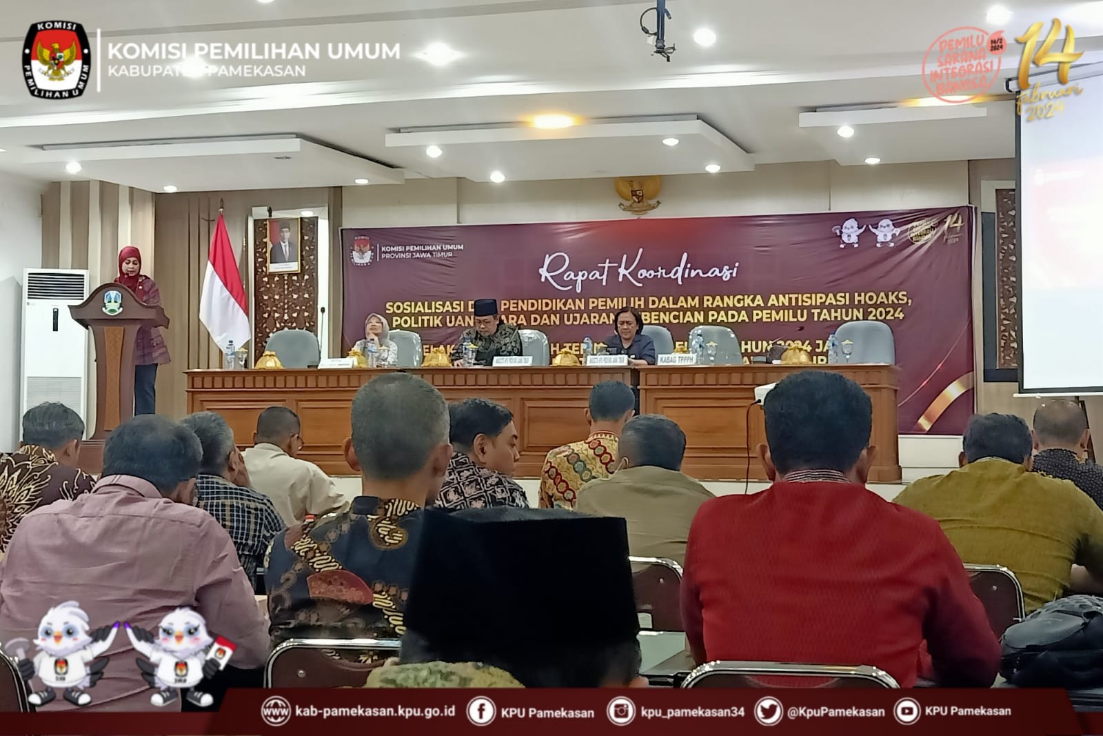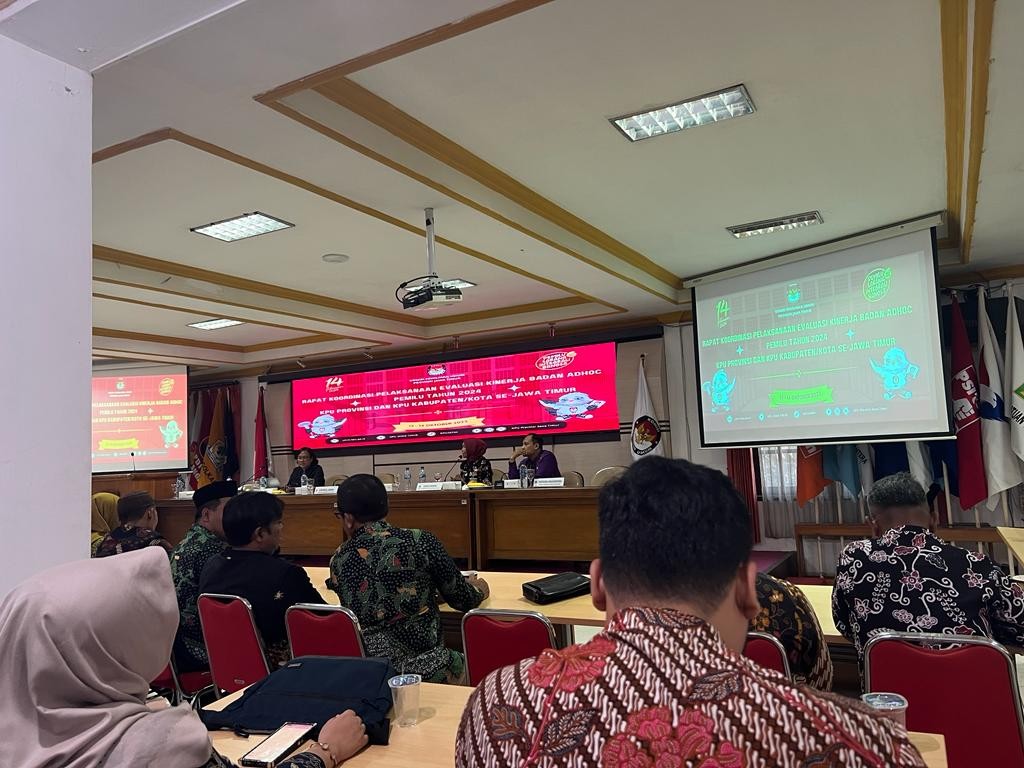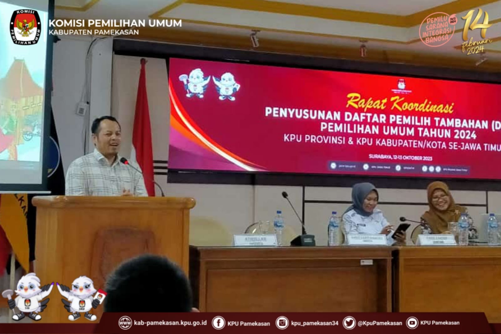 Surabaya, kab-pamekasan.kpu.go.id - Komisi Pemilihan Umum (KPU) Kabupaten Pamekasan menghadiri Rapat Koordinasi Penyusunan Daftar Pemilih Tambahan (DPTb) Pemilu Tahun 2024 yang diselenggarakan di KPU Jawa Timur. Kegiatan yang bertempat di Aula lantai 2 Kantor KPU Provinsi Jawa Timur, Jalan Raya Tenggilis Nomor 1 - 3 Surabaya, berlangsung selama 2 hari ini diikuti oleh Ketua Divisi Perencanaan, Data, dan Informasi, Kepala Subbagian Divisi Perencanaan, Data, dan Informasi, serta Operator Sistem Informasi Data Pemilih (Sidalih) KPU Kabupaten/Kota se-Jawa Timur. Anggota KPU Kabupaten Pamekasan, Ibnun Hasan Mahfud Divisi Data dan Informasi, Kasubbag Data dan Informasi, Akhmad Erfan Kusmant, dan Mohammad Helmi Fauzy Selaku Operator Sidalih Hadir mewakili KPU Kabupaten Pamekasan. Jumat (12 Oktober 2023). Ketua KPU Jawa Timur, Choirul Anam dalam sambutan pembukanya menyampaikan bahwa pelayanan DPTb menyisakan sembilan puluh hari lagi dimana persebarannya belum merata di berbagai kabupaten/kota di Jawa Timur. "Kita akan melakukan evaluasi dan pendalaman materi kembali terhadap pelayanan dan penyusunan DPTb," kata Ketua KPU Provinsi Jawa Timur. Selanjutnya, Anggota KPU Jawa Timur, Nurul Amalia mengingatkan agar dalam proses pelayanan pindah memilih perlu disertakan bukti pendukung sebagaimana ketentuan yang berlaku, karena memengaruhi penggunaan surat suara oleh pemilih. Nurul Amalia juga berharap bahwa pelayanan DPTb bisa memperoleh predikat terbaik dimana saat ini KPU Jawa Timur menjadi fokus dalam penilaian pelayanan publik dari Kementerian Pendayagunaan Aparatur Negara dan Reformasi Birokrasi (Kemenpan RB).