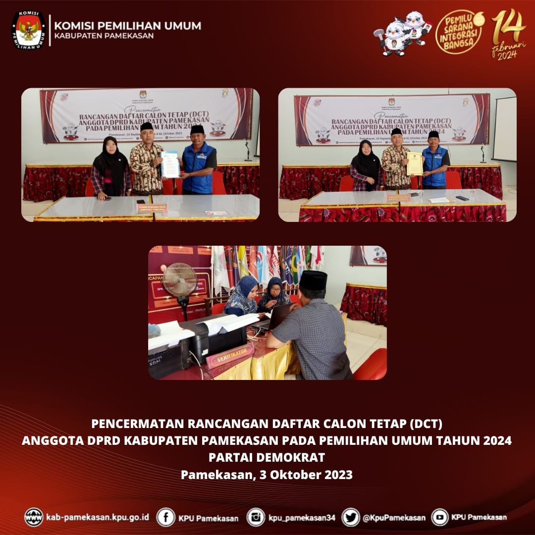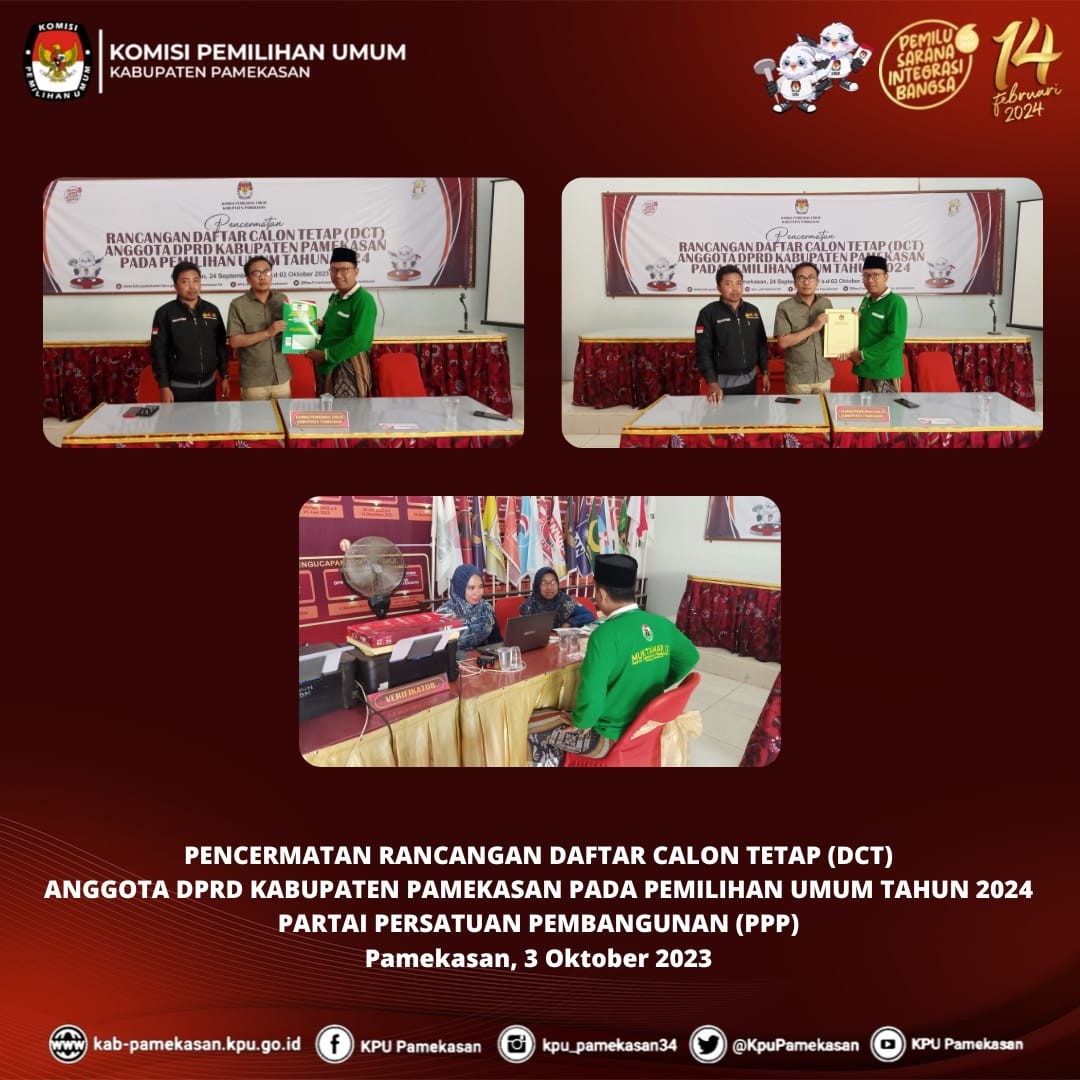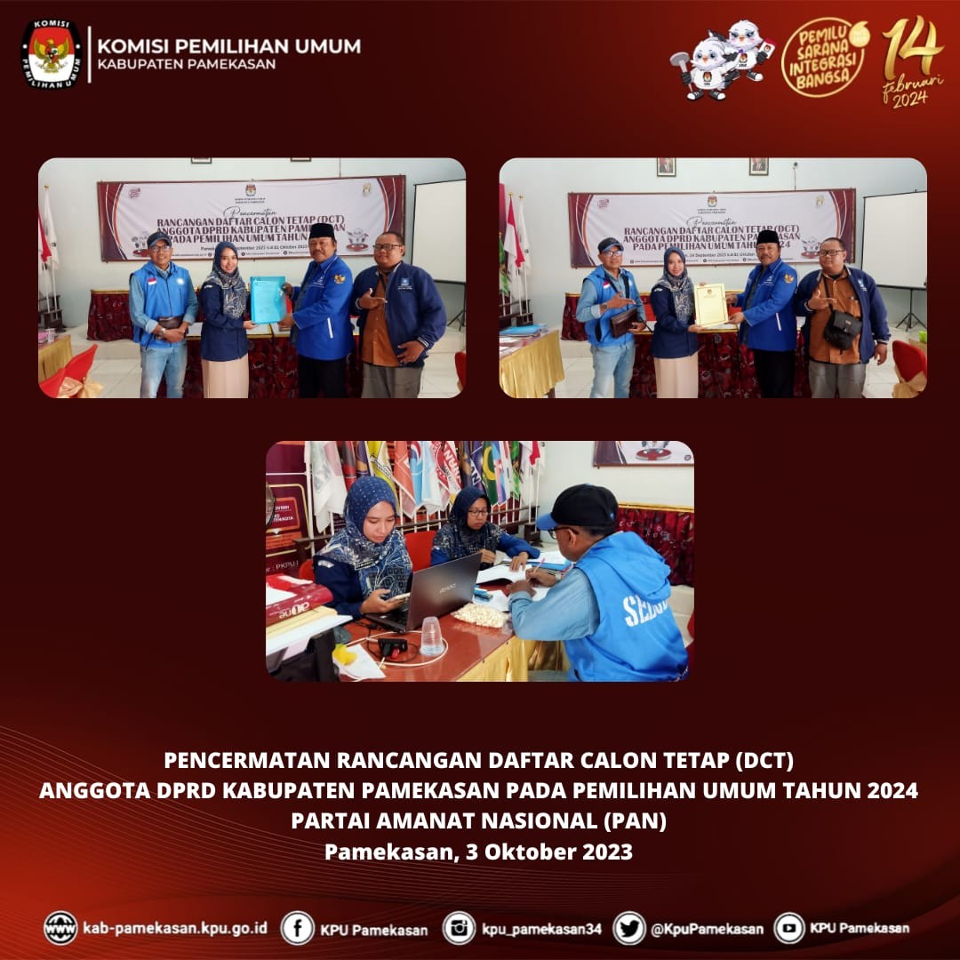 Pamekasan, kab-pamekasan.kpu.go.id – Komisi Pemilihan Umum (KPU) Kabupaten Pamekasan Penerimaan Pengajuan Perubahan Rancangan Daftar Calon Tetap (DPT) Anggota DPRD Kabupaten Pamekasan Pemilihan Umum Tahun 2024 oleh Partai Amanat Nasional (PAN), Senin (3 Oktober 2023) Pengajuan diterima oleh Kasubbag Teknis Penyelenggaraan Pemilu, Partisipasi, dan Hubungan Masyarakat, Dita Melavianty di Kantor KPU Pamekasan. Selanjutnya, berkas dokumen Perubahan diperiksa kelengkapannya oleh Admin beserta Operator SILON KPU Kabupaten Pamekasan. Moh. Amiruddin, Anggota KPU Pamekasan Divisi Teknis Penyelenggaraan menuturkan bahwa KPU Kabupaten Pamekasan akan segera menindaklanjuti pasca penyerahan ini. "Setelah penyerahan dokumen perbaikan telah selesai dilaksanakan, kami akan melakukan Verifikasi Administrasi dokumen Perubahan mulai 4 Oktober 2023 s.d 18 Oktober 2023 mendatang," Jelasnya. Pada akhir prosesi penyerahan, diserahkan Tanda Terima kepada Partai Amanat Nasional (PAN) oleh Kasubbag Teknis Penyelenggaraan Pemilu, Partisipasi, dan Hubungan Masyarakat, Dita Melavianty.