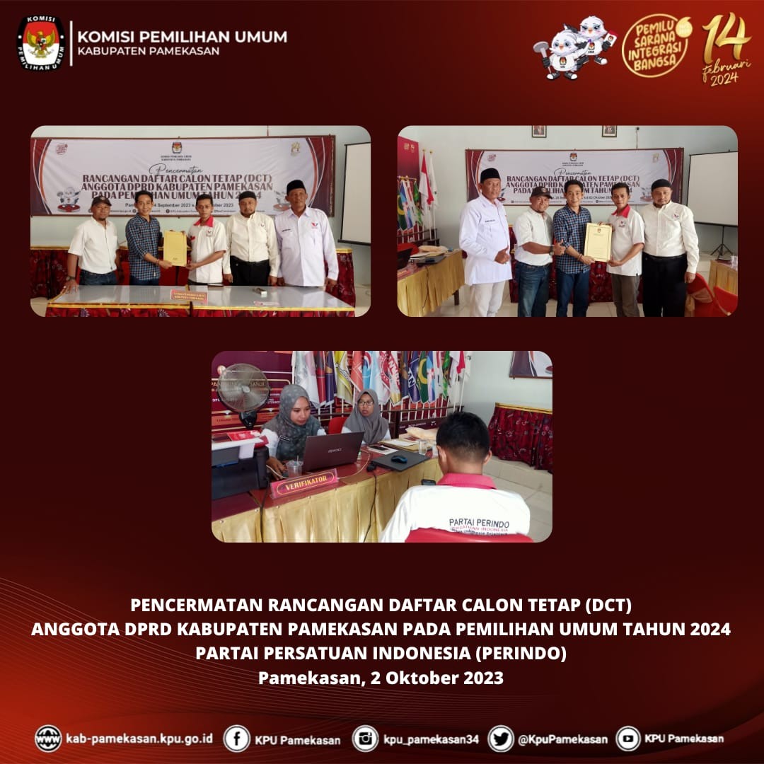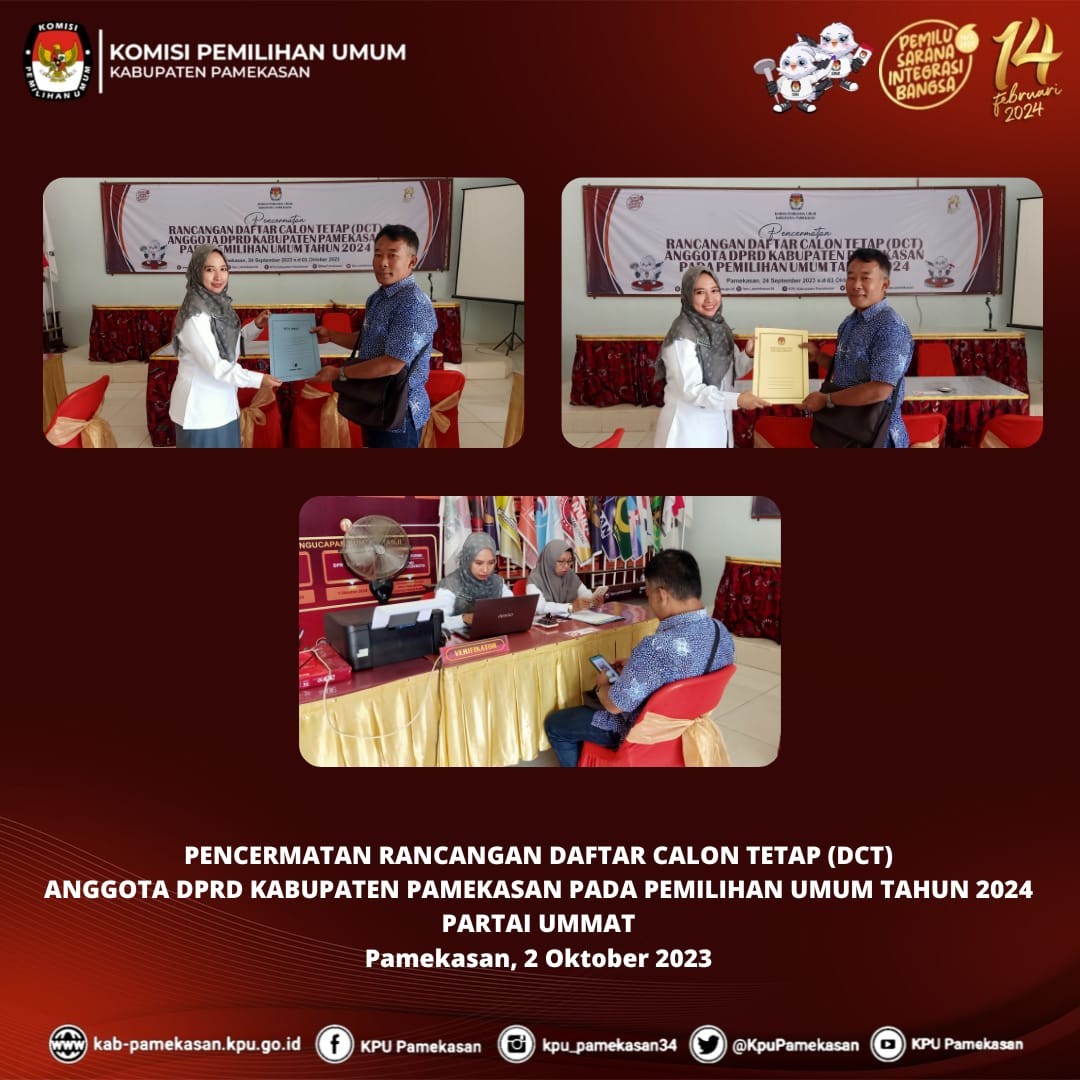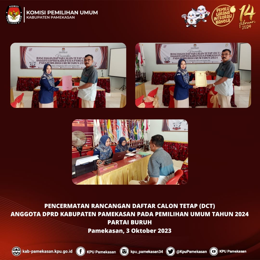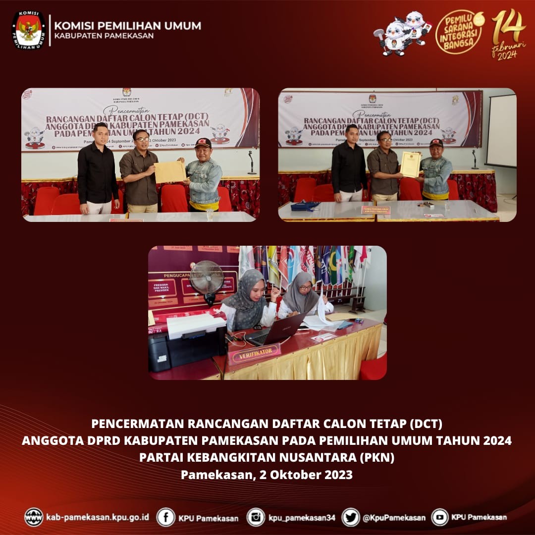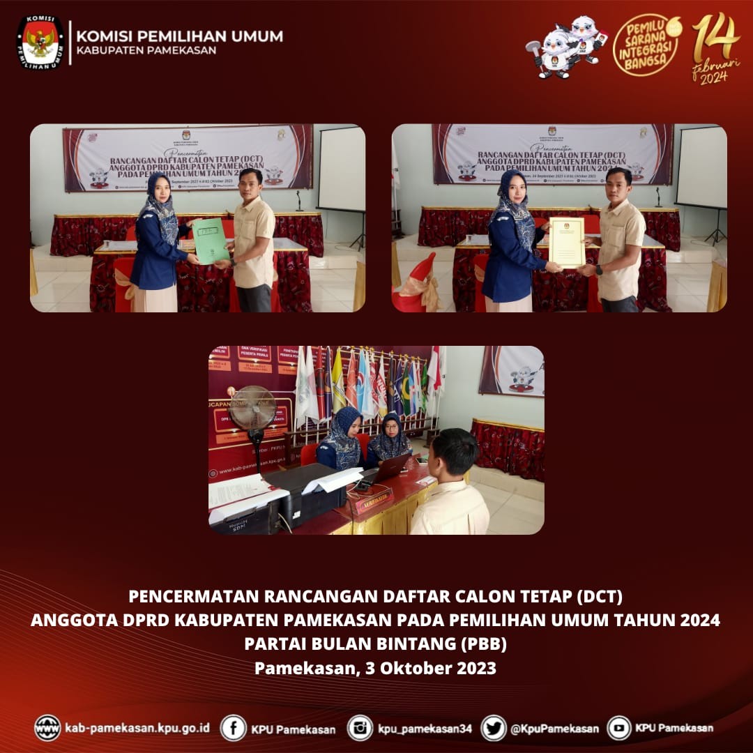 Pamekasan, kab-pamekasan.kpu.go.id – Komisi Pemilihan Umum (KPU) Kabupaten Pamekasan Penerimaan Pengajuan Perubahan Rancangan Daftar Calon Tetap (DPT) Anggota DPRD Kabupaten Pamekasan Pemilihan Umum Tahun 2024 oleh Partai Bulan Bintang (PBB), Selasa (3 Oktober 2023) Pengajuan diterima oleh Kasubbag Teknis Penyelenggaraan Pemilu, Partisipasi, dan Hubungan Masyarakat, Dita Melavianty di Kantor KPU Pamekasan. Selanjutnya, berkas dokumen Perubahan diperiksa kelengkapannya oleh Admin beserta Operator SILON KPU Kabupaten Pamekasan. Moh. Amiruddin, Anggota KPU Pamekasan Divisi Teknis Penyelenggaraan menuturkan bahwa KPU Kabupaten Pamekasan akan segera menindaklanjuti pasca penyerahan ini. "Setelah penyerahan dokumen perbaikan telah selesai dilaksanakan, kami akan melakukan Verifikasi Administrasi dokumen Perubahan mulai 4 Oktober 2023 s.d 18 Oktober 2023 mendatang," Jelasnya. Pada akhir prosesi penyerahan, diserahkan Tanda Terima kepada Partai Bulan Bintang (PBB) oleh Kasubbag Teknis Penyelenggaraan Pemilu, Partisipasi, dan Hubungan Masyarakat, Dita Melavianty.