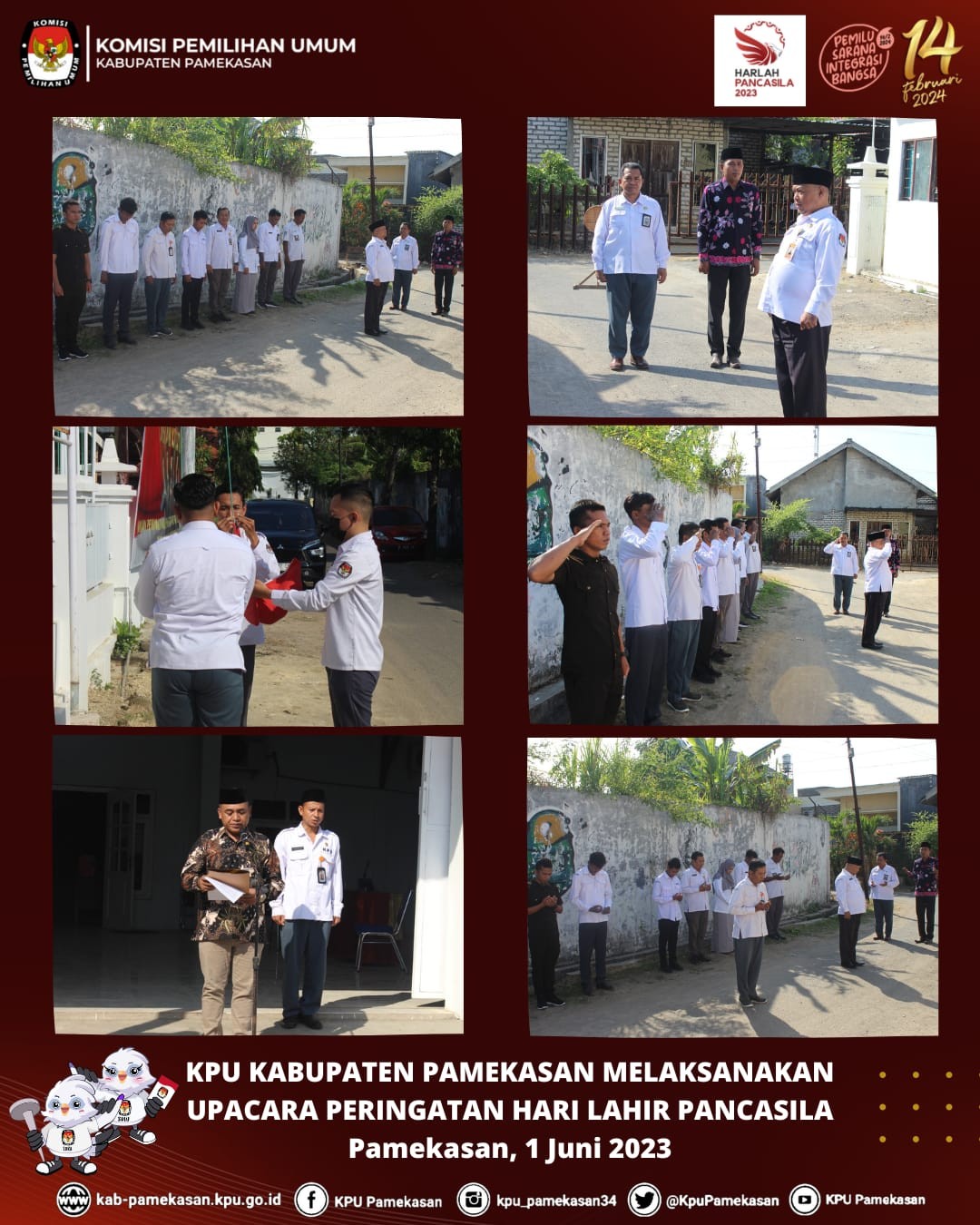 Pamekasan - kab-pamekasan.kpu.go.id - Menindaklanjuti surat edaran Komisi Pemilihan Umum nomor 7 tahun 2023 tentang Pedoman Peringatan Hari Lahir Pancasila Tahun 2023, Komisi Pemilihan Umum Kabupaten (KPU) Pamekasan melaksanakan upacara Bendera dalam rangka memperingati Hari Lahir Pancasila yang diikuti oleh Ketua, Anggota, Sekretaris, Kasubbag dan jajaran Sekretariat KPU Pamekasan, Acara dimulai pada pukul 08.00 WIB di halaman Kantor KPU Kabupaten Pamekasan Jl. Brawijaya no 34 Kelurahan Jungcangcang. Kamis, (1 Juni 2023) Bertindak sebagai inspektur upacara kali ini adalah Mohammad Halili, Ketua KPU Kabupaten Pamekasan, Dalam amanatnya, Halili menyampaikan Peringatan Hari Lahir Pancasila tahun ini menjadi momen penting untuk merefleksikan nilai-nilai Pancasila dan mendorong kerja sama global yang saling menguntungkan. KPU Pamekasan berkomitmen untuk terus memperjuangkan semangat gotong royong dan pertumbuhan global dalam menjalankan tugas dan tanggung jawab “Mari seluruh staf KPU Pamekasan untuk bisa mengimplementasikan nilai-nilai Pancasila dalam melaksanakan Tahapan Pemilu 2024, yang semakin padat ini,” Ajaknya