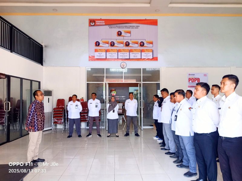 Pamekasan, 11 Agustus 2025 – Komisi Pemilihan Umum (KPU) Kabupaten Pamekasan menggelar apel pagi di Aula KPU Pamekasan pada Senin, 11 Agustus 2025, pukul 07.30 WIB. Apel yang diikuti seluruh jajaran pegawai ini dipimpin oleh Anggota KPU Pamekasan, Moh. Amiruddin, sebagai pembina.