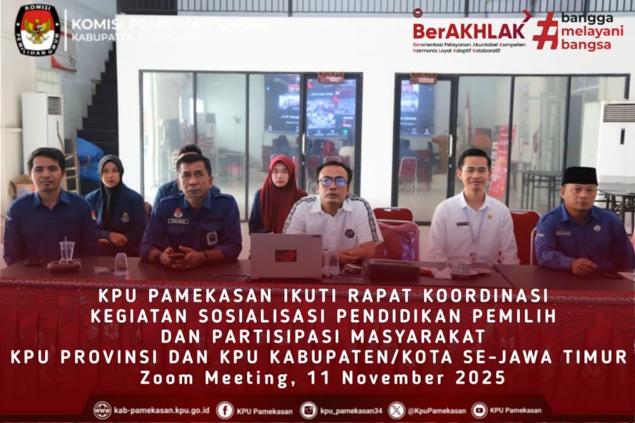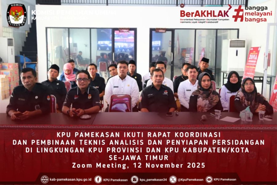 Pamekasan, 12 November 2025 – Komisi Pemilihan Umum (KPU) Kabupaten Pamekasan telah mengikuti Rapat Koordinasi dan Pembinaan Teknis Analisis dan Penyiapan Persidangan di Lingkungan Sekretariat KPU Provinsi dan Kabupaten/Kota se-Jawa Timur. Kegiatan ini dilaksanakan secara daring (Zoom Meeting) pada hari Rabu, 12 November 2025, mulai pukul 13.00 WIB hingga selesai. Pelaksanaan rapat koordinasi ini merupakan tindak lanjut dari Surat Tugas Sekretaris Jenderal Komisi Pemilihan Umum Nomor: 2063/RT.02.1-ST/03/2025 tertanggal 7 Oktober 2025. Fokus Utama Materi Kegiatan pembinaan teknis ini fokus pada peningkatan kapasitas staf dan sekretariat dalam menghadapi potensi sengketa atau permasalahan hukum yang memerlukan proses persidangan. Hal ini sangat krusial mengingat kompleksitas tahapan Pemilu dan Pilkada yang selalu membutuhkan kesiapan data, analisis, dan dokumentasi yang kuat. Materi: Koordinasi dan Pembinaan Teknis Analisis dan Penyiapan Persidangan di Lingkungan Sekretariat KPU Provinsi dan Kabupaten/Kota se-Jawa Timur. Sesi inti pembinaan teknis menghadirkan narasumber dari Sekretariat Jenderal KPU RI, yang memberikan arahan langsung terkait standar operasional dan strategi dalam penyiapan persidangan.