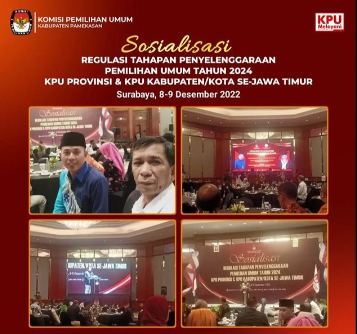 Pamekasan; Jum'at (9/12/22) Dalam rangka penyelenggaraan Pemilihan Umum Tahun 2024, KPU kabupaten Pamekasan menghadiri kegiatan Sosialisasi Regulasi Tahapan Penyelenggaraan Pemilihan Umum Tahun 2024 KPU