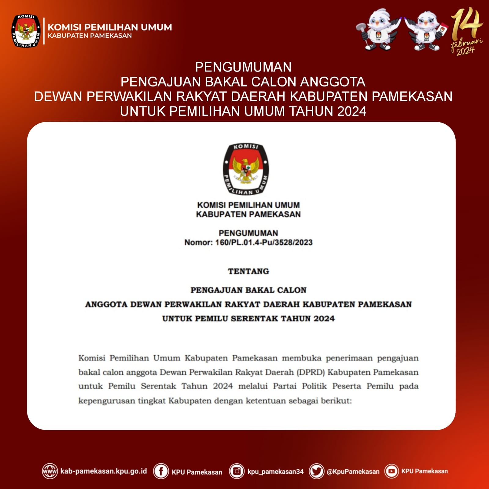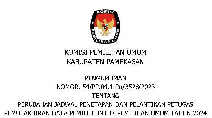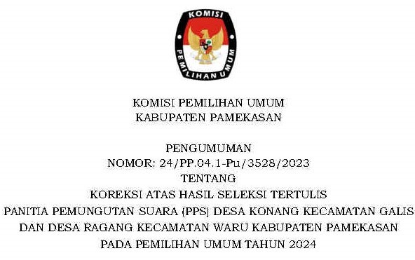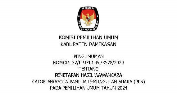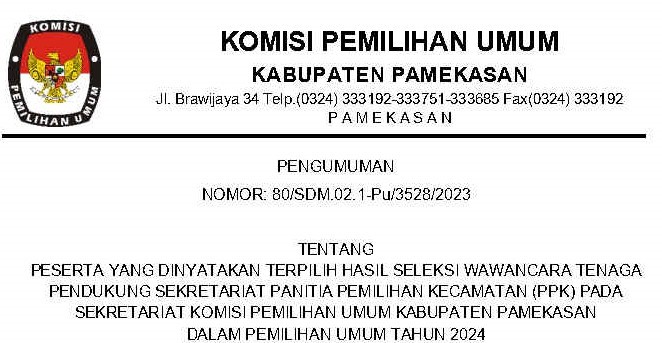 PENGUMUMAN NOMOR: 80/SDM.02.1-Pu/3528/2023 TENTANG PESERTA YANG DINYATAKAN TERPILIH HASIL SELEKSI WAWANCARA TENAGA PENDUKUNG SEKRETARIAT PANITIA PEMILIHAN KECAMATAN (PPK) PADA SEKRETARIAT KOMISI PEMILIHAN UMUM KABUPATEN PAMEKASAN DALAM PEMILIHAN UMUM TAHUN 2024 Berdasarkan Berita Acara Nomor: 78/SDM/02.1-BA/3528/2023 pada hari Rabu tanggal Delapan bulan Maret tahun Dua Ribu Dua Puluh Tiga tentang Penetapan Hasil Wawancara Seleksi Tenaga Pendukung Sekretariat Panitia Pemilihan Kecamatan (PPK) pada Sekeratariat Komisi Pemilihan Umum Kabupaten Pamekasan dalam Pemilihan Umum Tahun 2024, diumumkan bahwa peserta sesuai lampiran dinyatakan Terpilih dalam Seleksi Wawancara. Sehubungan dengan hal tersebut diatas, Komisi Pemilihan Umum Kabupaten Pamekasan mengharap agar calon tenaga pendukung terpilih menyampaikan dokumen berikut: 1. Surat Keterangan Catatan Kepolisian (SKCK); 2. Surat Keterangan Sehat Jasmani dan Rohani dari dokter; dan 3. Menyiapkan Materai Rp. 10.000,- sebanyak 2 (dua) lembar. Berkas disampaikan pada hari Senin tanggal 13 Maret 2023. Pengumuman Hasil Seleksi Wawancara Tenaga Pendukung diumumkan secara online melalui website htpps://Kab-Pamekasan.kpu.go.id Lampiran Pengumuman <<download>>
