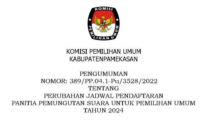 PENGUMUMAN NOMOR: 20/PP.04.1-Pu/3528/2023 TENTANG PENETAPAN HASIL SELEKSI TERTULIS PANITIA PEMUNGUTAN SUARA (PPS) DI KABUPATEN PAMEKASAN PADA PEMILIHAN UMUM TAHUN 2024 Berdasarkan Berita Acara Rapat Pleno KPU Kabupaten Pamekasan Nomor 32/PP.04.1-BA/3528/2023 tanggal 14 Januari 2023 tentang Hasil Seleksi Tertulis Calon Anggota Panitia Pemungutan Suara (PPS) Pada Pemilihan Umum Tahun 2024, disampaikan hal-hal sebagai berikut: KPU Kabupaten Pamekasan telah melaksanakan Tahapan Seleksi Tertulis Calon Anggota Panitia Pemungutan Suara (PPS) Pada Pemilihan Umum Tahun 2024 pada tanggal 9 Januari 2023; KPU Kabupaten Pamekasan menetapkan Daftar Nama Calon Anggota PPS yang Lulus Seleksi Tertulis Calon Anggota Panitia Pemungutan Suara (PPS) di masing-masing Desa/Kelurahan di Kabupaten Pamekasan untuk Pemilu Tahun 2024 sebagaimana daftar terlampir pada LAMPIRAN I; Seluruh masyarakat Kabupaten Pamekasan dapat memberikan masukan dan tanggapan terhadap rekam jejak Calon Anggota Panitia Pemungutan Suara (PPS) dimaksud, yang disampaikan secara tertulis dengan menyertakan identitas diri (KTP) yang masih berlaku kepada Helpdesk Pembentukan Badan Adhoc KPU Kabupaten Pamekasan, sejak pengumuman ini diumumkan sampai dengan 23 Januari 2023 melalui email hukumsdm.kpukabpamekasan@gmail.com atau datang langsung ke Kantor KPU Kabupaten Pamekasan, Jl. Brawijaya No. 34 Jungcangcang, Pamekasan pada jam kerja Pukul 08.00 s.d. 16.00 WIB. KPU Kabupaten Pamekasan mengundang calon anggota Panitia Pemungutan Suara (PPS) yang dinyatakan Lulus Tahap Seleksi Tertulis untuk hadir dalam Tes Wawancara, pada : Hari : Rabu s.d. Kamis Tanggal : 18 s.d. 19 Januari 2023 Pukul : TERLAMPIR pada LAMPIRAN II Tempat : Gedung PKP-RI Pamekasan Jalan Kemuning No. 22, RW 03, Barurambat, Pamekasan Materi : pengetahuan kepemiluan; komitmen yang mencakup integritas, independensi dan profesionalitas; rekam jejak calon anggota PPS; dan klarifikasi masukan dan tanggapan masyarakat. Catatan : dimohon hadir tepat waktu; Pakaian Laki-laki : Kemeja Putih, Celana Hitam, bersepatu Perempuan : Kemeja Putih, Celana/Rok Hitam, bersepatu menunjukkan Tanda Bukti Pendaftaran Peserta SIAKBA dan Kartu Identitas Diri Elektronik (e-KTP) yang asli kepada petugas saat pelaksanaan registrasi. Demikian pengumuman ini disampaikan untuk menjadi perhatian. File Pengumum <<download>> Jadwal Tes Wawancara <<download>>