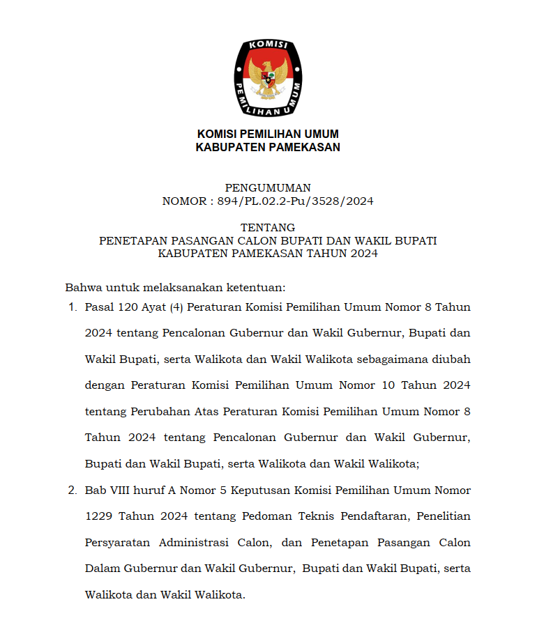 Bab VI huruf D dan Bab VII huruf A Keputusan Komisi Pemilihan Umum Nomor 1229 Tahun 2024 tentang Pedoman Teknis Pendaftaran, Penelitian Persyaratan Administrasi Calon, dan Penetapan Pasangan Calon Dalam Gubernur dan Wakil Gubernur, Bupati dan Wakil Bupati, serta Walikota dan Wakil Walikota.