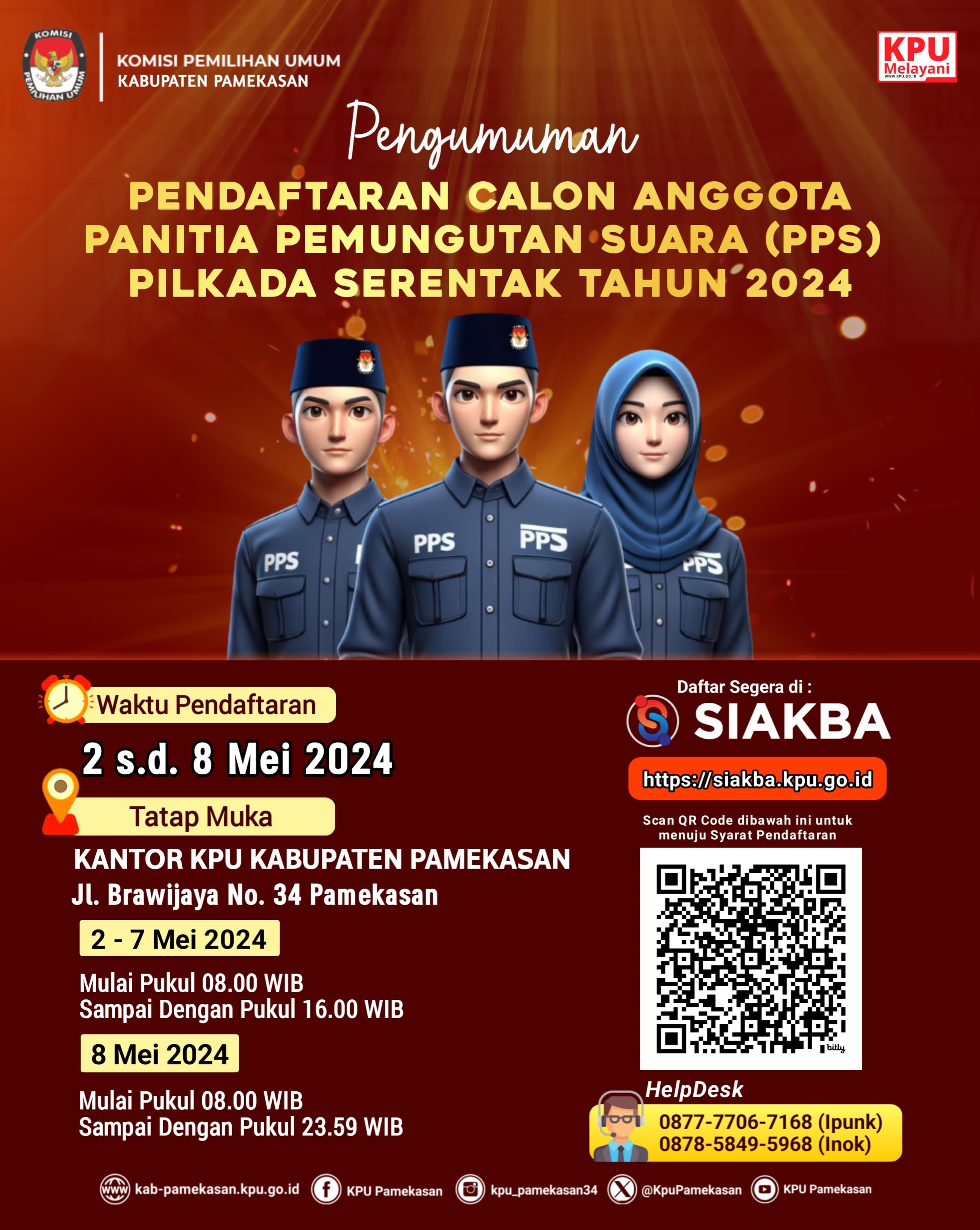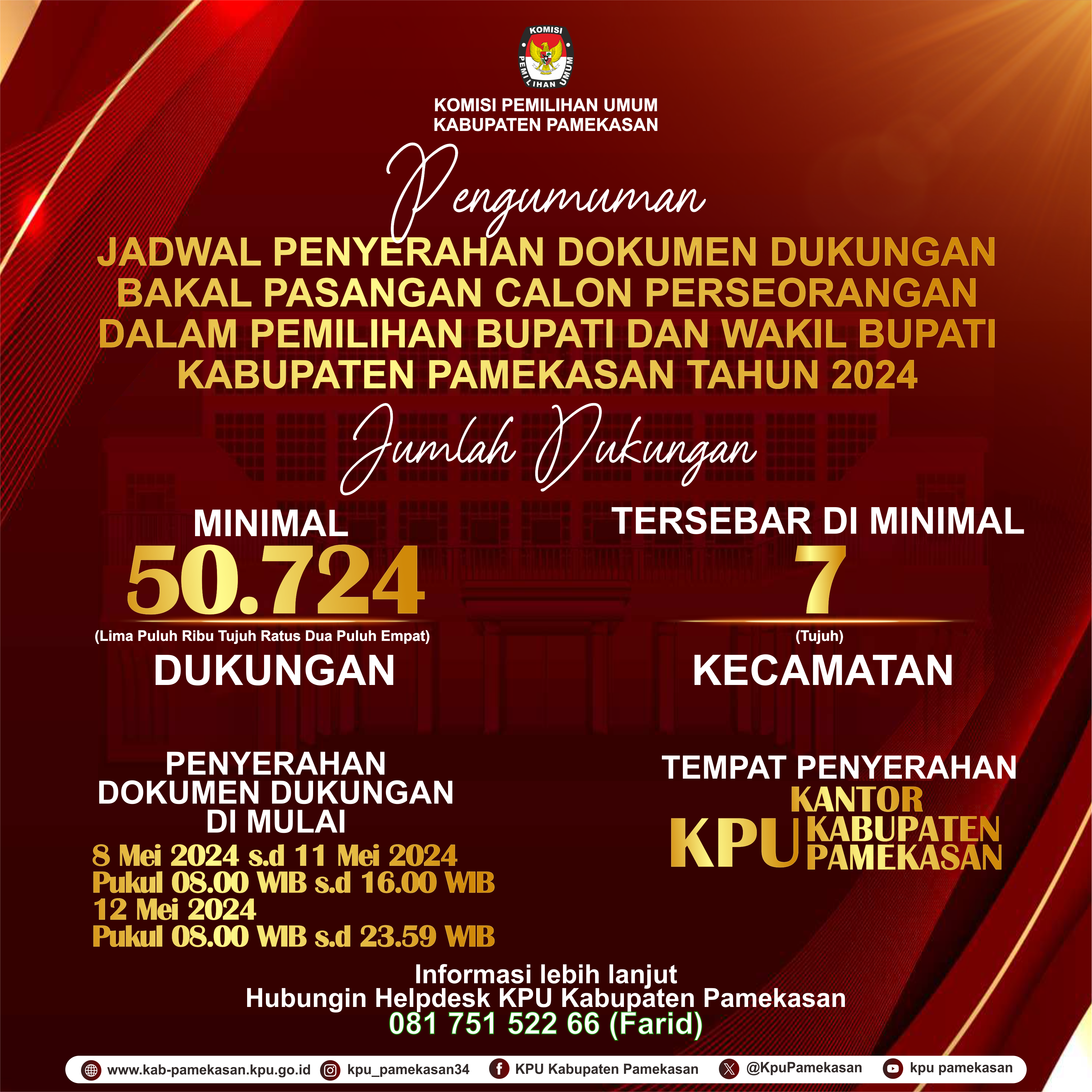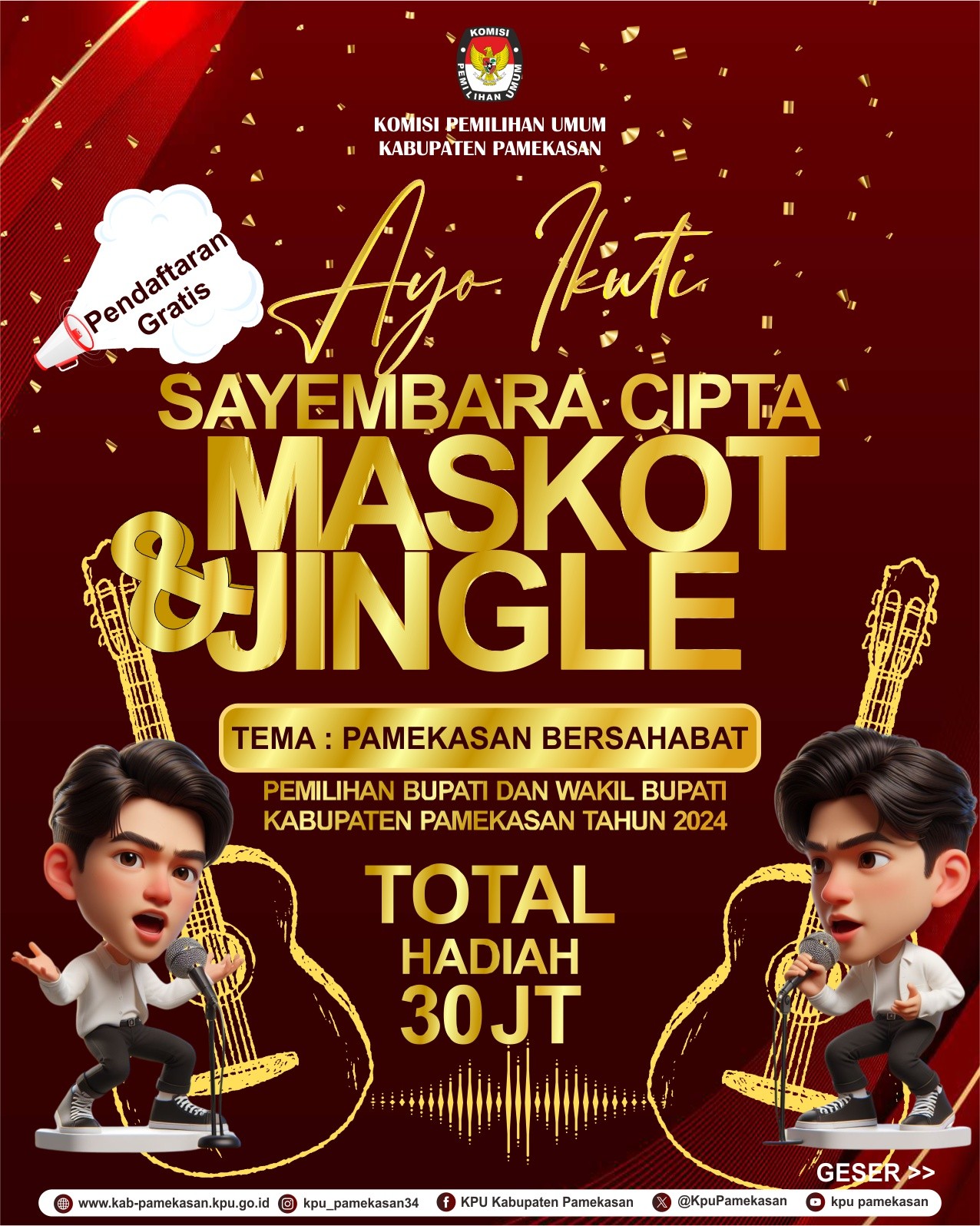 TEMA: PAMEKASAN BERSAHABAT KETENTUAN UMUM Peserta dalah Warga Negara Indonesia (WNI), dibuktikan dengan identitas diri e-KTP/SIM/Kartu Pelajar/Mahasiswa; Seluruh pejabat dan pegawai KPU, KPU Provinsi, KPU Kabupaten/Kota, badan ad hoc, dan tim juri dilarang mengikuti lomba; Setiap peserta dapat mengirimkan maksimal tiga (3) karya terbaik; Karya belum pernah dipublikasikan untuk lomba yang sejenis; Karya yang dipilih sebagai pemenang menjadi hak milik KPU Kabupaten Pamekasan, dan akan digunakan untuk keperluan sosialiasasi pada Pemilihan Kabupaten Pamekasan Tahun 2024. Sedangkan karya yang tidak terpilih menjadi pemenang, hak cipta tetap pada peserta; KPU Kabupaten Pamekasan memiliki hak terhadap karya pemenang untuk mengubah dan/atau menyempurnakan karya yang terpilih sebagai pemenang sesuai dengan kebutuhan; Setiap karya disertai narasi tertulis atas konsep dan filosofi maskot serta jingle dalam format word; Karya mencerminkan nilai demokrasi, nonpartisan, inklusif, tidak mengandung unsur SARA dan pornografi, memotivasi untuk mengajak masyarakat menggunakan hak pilih pada Pemilihan Bupati dan Wakil Bupati Pamekasan Tahun 2024; Apabila di kemudian hari diketahui dan terbukti bahwa hasil karya yang ditetapkan sebagai pemenang ternyata bukan hasil karya asli peserta, maka pemenang lomba dibatalkan, harus mengembalikan hadiah yang telah diterima, serta akan dikenakan sanksi sesuai dengan peraturan perundang-undangan (Download Surat Pernyataan " KLIK DISINI ") atau https://bit.ly/surat-pernyataan-lomba-maskot-jinggel-pamekasan ; Peserta tidak dipungut biaya pendaftaran (gratis); Peserta mengisi formulir pendaftaran, mengupload karya, beserta scan pernyataan karya asli yang diunduh dari website KPU Kabupaten Pamekasan (Formulir Pendaftaran Lomba Maskot https://bit.ly/maskot-pilbup-pamekasan-2024, Formulir Pendaftaran Lomba Jingle https://bit.ly/jinggel-pilbup-pamekasan-2024); Keputusan Dewan Juri bersifat mutlak dan tidak dapat diganggu gugat; Pemenang lomba akan diumumkan di website KPU Kabupaten Pamekasan, dan dihubungi oleh KPU Kabupaten Pamekasan; Karya maskot dan jingle dikumpulkan pada tanggal 6 Mei - 25 Mei 2024. Batas akhir pengiriman tanggal 25 Mei 2024, pukul 16.00 WIB. KETENTUAN KHUSUS LOMBA CIPTA MASKOT Desain maskot harus mencantumkan logo KPU; Desain maskot menekankan pada orisinalitas karya, relevansi maskot dengan lokalitas, unsur estetika, menarik, unik, mudah dipahami, ada unsur filosofis, mengandung entitas Pamekasan (bangunan ikonik, flora/fauna endemik, kultur, seni, budaya, dan historis/mitos); Maskot dapat diaplikasikan di berbagai media lain; Desain Maskot dikirimkan dalam bentuk softfile dalam format PNG/Ai/cmd dengan resolusi 300 dpi; Bila peserta masuk menjadi finalis, wajib mengirimkan file asli dalam bentuk format vector base pdf. KETENTUAN KHUSUS LOMBA CIPTA JINGLE Jingle dapat dinyanyikan secara solo maupun grup; Durasi jingle maksimal 2,5 menit dan tidak ada pengulangan; Jingle diiringi paling sedikit 1 instrumen musik; Jingle berbahasa Indonesia dan dapat dikombinasikan dengan bahasa daerah di Jawa Timur dengan semangat mengajak berbagai elemen untuk menyukseskan Pemilihan Bupati dan Wakil Bupati Pamekasan Tahun 2024; Jingle menekankan pada orisinalitas karya, kesesuaian dengan tema, unsur lokalitas, pilihan diksi dalam lirik, kualitas audio; Lirik dan irama Jingle ditulis dalam not balok atau angka yang diketik; Jingle direkam dalam format MP4/MP3/AAC. LAIN-LAIN Maskot Juara I 6.000.000 Juara II 3.000.000 Juara III 2.000.000 Jingle Juara I 8.000.000 Juara II 5.000.000 Juara III 3.000.000 **Pajak ditanggung pemenang