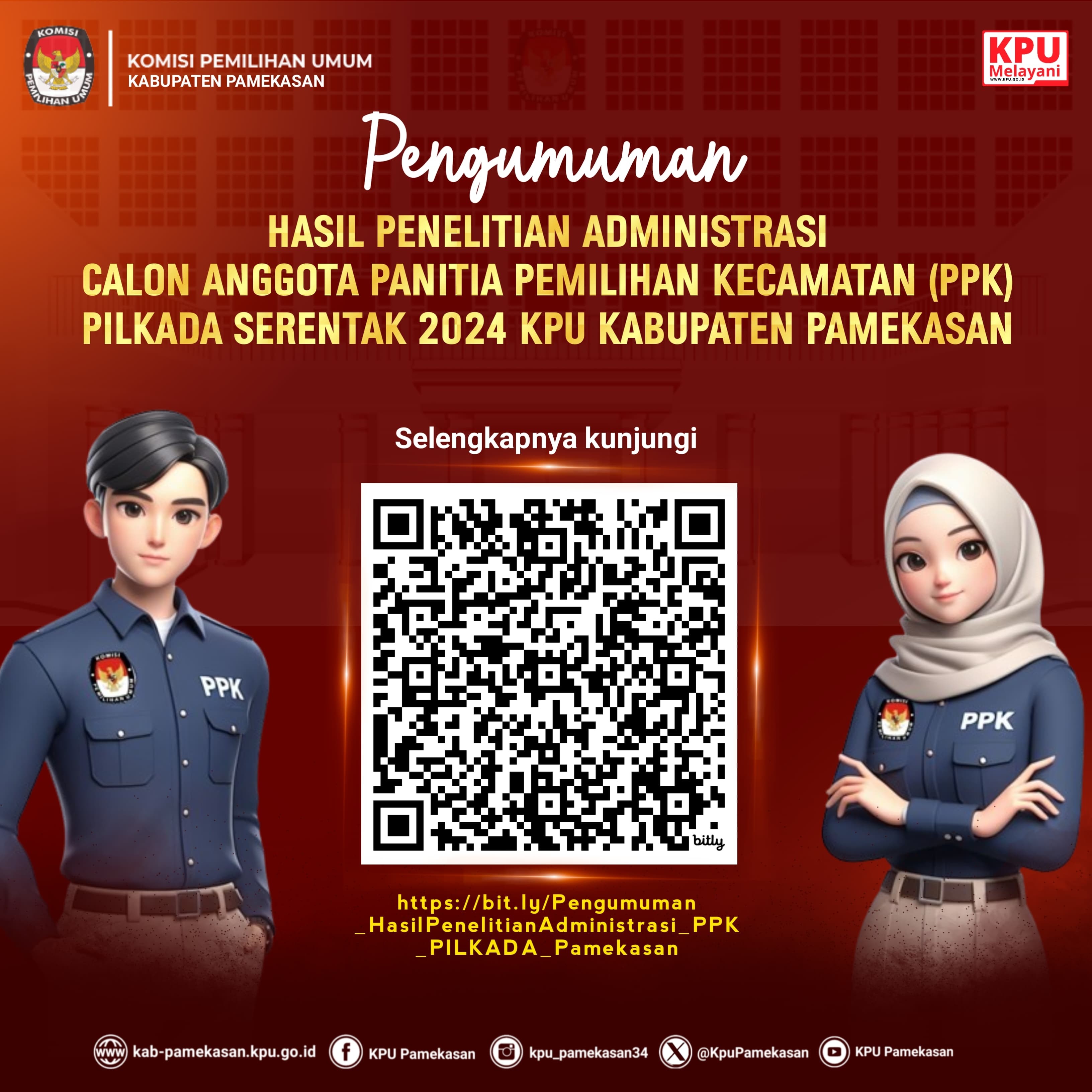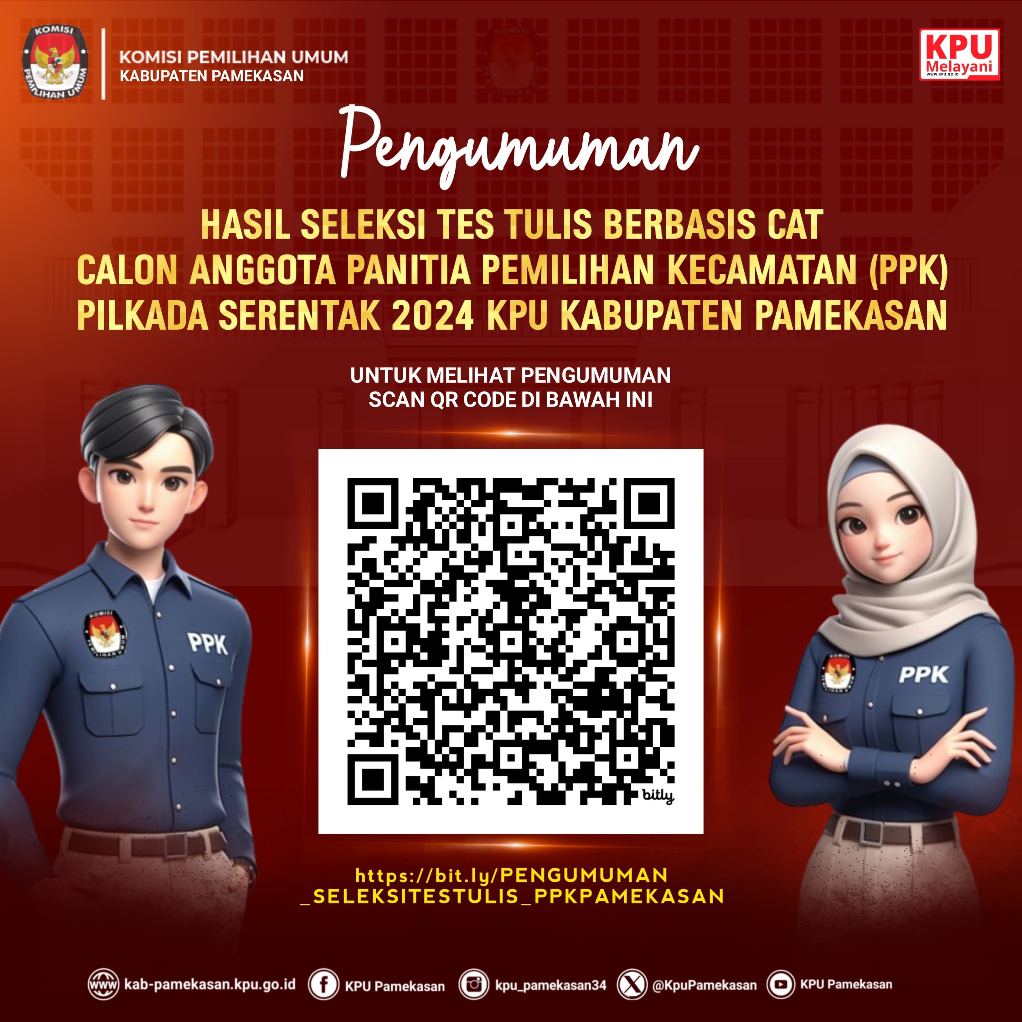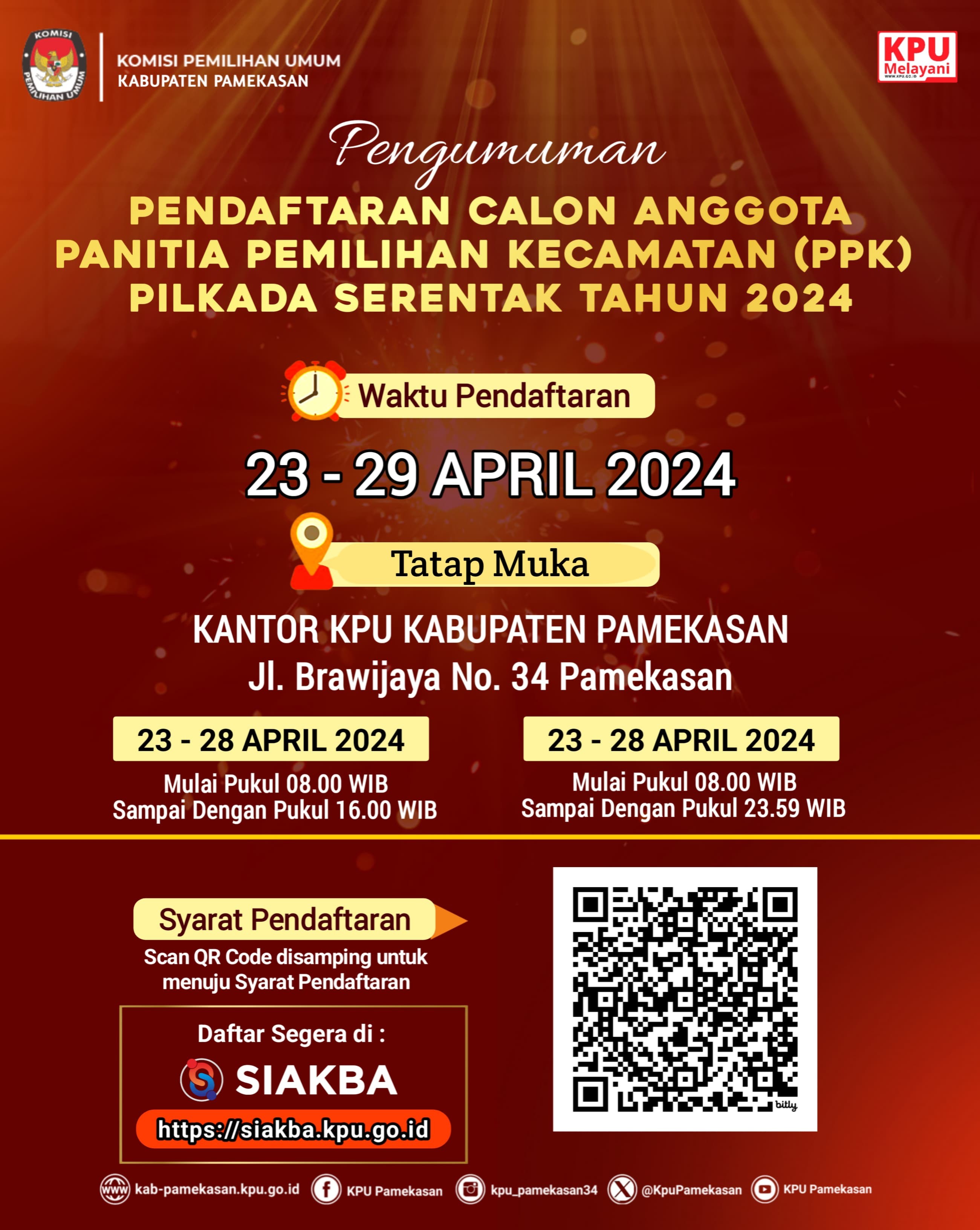 TEMA: PAMEKASAN BERSAHABAT KETENTUAN UMUM Peserta dalah Warga Negara Indonesia (WNI), dibuktikan dengan identitas diri e-KTP/SIM/Kartu Pelajar/Mahasiswa; Seluruh pejabat dan pegawai KPU, KPU Provinsi, KPU Kabupaten/Kota, badan ad hoc, dan tim juri dilarang mengikuti lomba; Setiap peserta dapat mengirimkan maksimal tiga (3) karya terbaik; Karya belum pernah dipublikasikan untuk lomba yang sejenis; Karya yang dipilih sebagai pemenang menjadi hak milik KPU Kabupaten Pamekasan, dan akan digunakan untuk keperluan sosialiasasi pada Pemilihan Kabupaten Pamekasan Tahun 2024. Sedangkan karya yang tidak terpilih menjadi pemenang, hak cipta tetap pada peserta; KPU Kabupaten Pamekasan memiliki hak terhadap karya pemenang untuk mengubah dan/atau menyempurnakan karya yang terpilih sebagai pemenang sesuai dengan kebutuhan; Setiap karya disertai narasi tertulis atas konsep dan filosofi maskot serta jingle dalam format word; Karya mencerminkan nilai demokrasi, nonpartisan, inklusif, tidak mengandung unsur SARA dan pornografi, memotivasi untuk mengajak masyarakat menggunakan hak pilih pada Pemilihan Bupati dan Wakil Bupati Pamekasan Tahun 2024; Apabila di kemudian hari diketahui dan terbukti bahwa hasil karya yang ditetapkan sebagai pemenang ternyata bukan hasil karya asli peserta, maka pemenang lomba dibatalkan, harus mengembalikan hadiah yang telah diterima, serta akan dikenakan sanksi sesuai dengan peraturan perundang-undangan (Download Surat Pernyataan " KLIK DISINI ") atau https://bit.ly/surat-pernyataan-lomba-maskot-jinggel-pamekasan ; Peserta tidak dipungut biaya pendaftaran (gratis); Peserta mengisi formulir pendaftaran, mengupload karya, beserta scan pernyataan karya asli yang diunduh dari website KPU Kabupaten Pamekasan (Formulir Pendaftaran Lomba Maskot https://bit.ly/maskot-pilbup-pamekasan-2024, Formulir Pendaftaran Lomba Jingle https://bit.ly/jinggel-pilbup-pamekasan-2024); Keputusan Dewan Juri bersifat mutlak dan tidak dapat diganggu gugat; Pemenang lomba akan diumumkan di website KPU Kabupaten Pamekasan, dan dihubungi oleh KPU Kabupaten Pamekasan; Karya maskot dan jingle dikumpulkan pada tanggal 6 Mei - 25 Mei 2024. Batas akhir pengiriman tanggal 25 Mei 2024, pukul 16.00 WIB. KETENTUAN KHUSUS LOMBA CIPTA MASKOT Desain maskot harus mencantumkan logo KPU; Desain maskot menekankan pada orisinalitas karya, relevansi maskot dengan lokalitas, unsur estetika, menarik, unik, mudah dipahami, ada unsur filosofis, mengandung entitas Pamekasan (bangunan ikonik, flora/fauna endemik, kultur, seni, budaya, dan historis/mitos); Maskot dapat diaplikasikan di berbagai media lain; Desain Maskot dikirimkan dalam bentuk softfile dalam format PNG/Ai/cmd dengan resolusi 300 dpi; Bila peserta masuk menjadi finalis, wajib mengirimkan file asli dalam bentuk format vector base pdf. KETENTUAN KHUSUS LOMBA CIPTA JINGLE Jingle dapat dinyanyikan secara solo maupun grup; Durasi jingle maksimal 2,5 menit dan tidak ada pengulangan; Jingle diiringi paling sedikit 1 instrumen musik; Jingle berbahasa Indonesia dan dapat dikombinasikan dengan bahasa daerah di Jawa Timur dengan semangat mengajak berbagai elemen untuk menyukseskan Pemilihan Bupati dan Wakil Bupati Pamekasan Tahun 2024; Jingle menekankan pada orisinalitas karya, kesesuaian dengan tema, unsur lokalitas, pilihan diksi dalam lirik, kualitas audio; Lirik dan irama Jingle ditulis dalam not balok atau angka yang diketik; Jingle direkam dalam format MP4/MP3/AAC. LAIN-LAIN Maskot Juara I 6.000.000 Juara II 3.000.000 Juara III 2.000.000 Jingle Juara I 8.000.000 Juara II 5.000.000 Juara III 3.000.000 **Pajak ditanggung pemenang