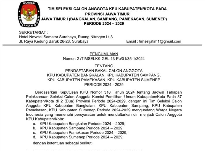 Pengumuman Pendaftaran Bacalon Anggota KPU Kabupaten Bangkalan, KPU Kabupaten Sampang, KPU Kabupaten Pamekasan dan KPU Kabupaten Sumenep ada di zona Jawa Timur 1. Berikut disampaikan Pengumuman Tentang Pendaftaran Bakal Calon Anggota KPU Kabupaten/Kota pada 36 Kabupaten/Kota di Jawa Timur Periode 2024-2029