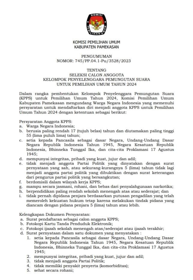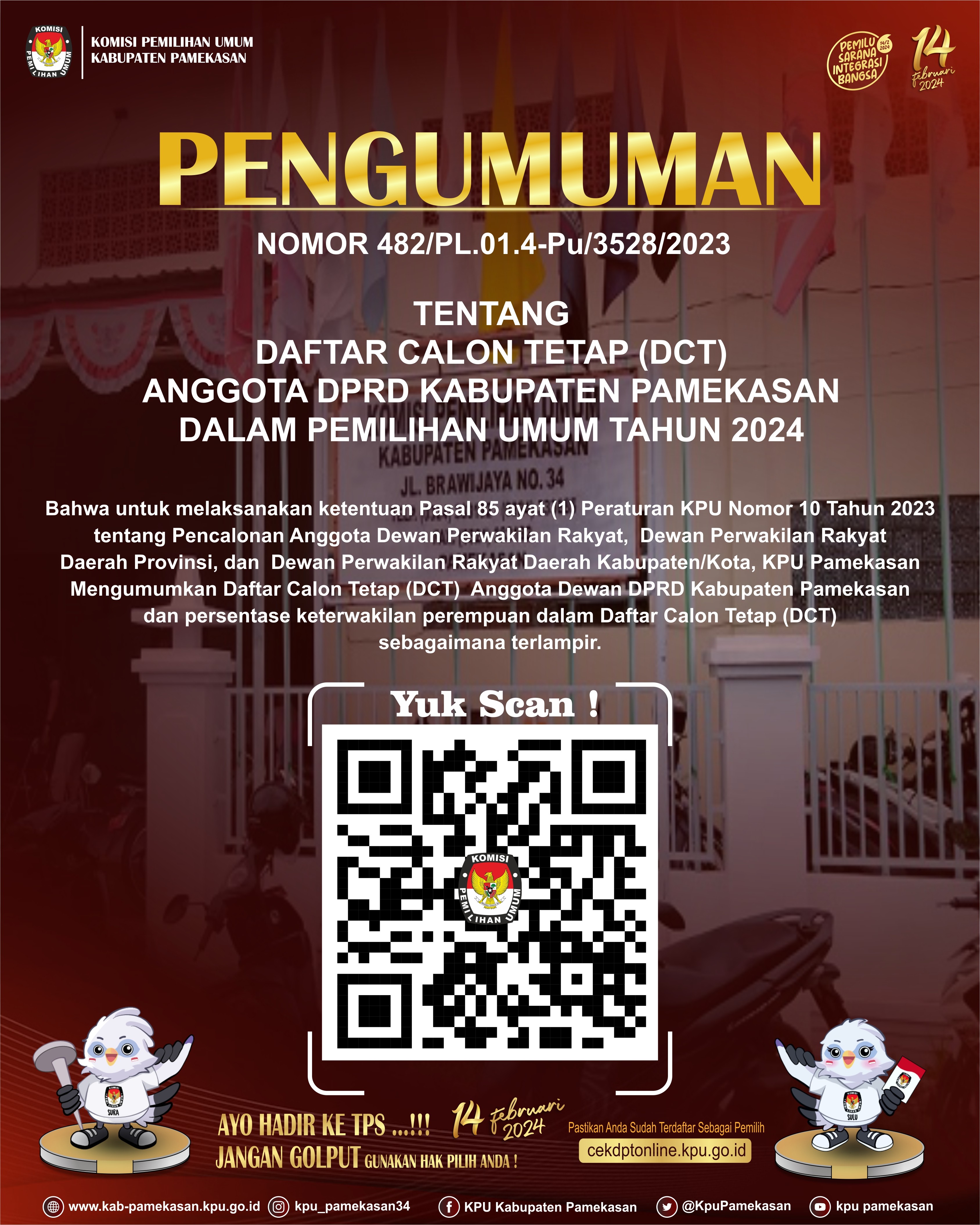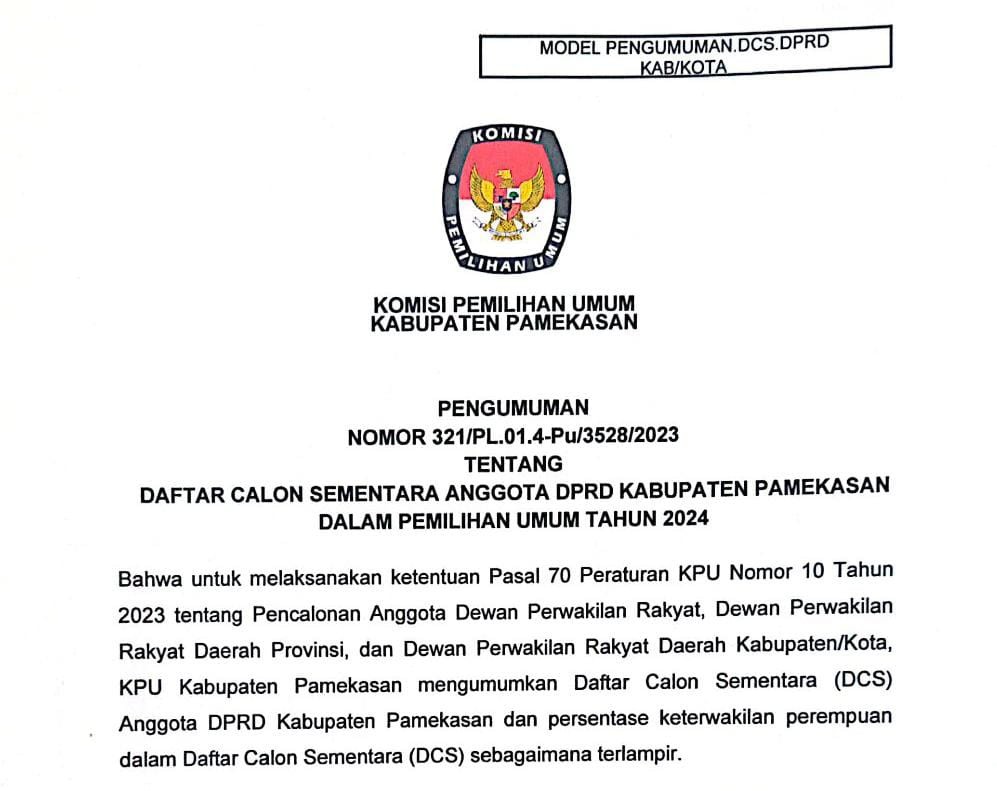 Bahwa untuk melaksanakan ketentuan Pasal 70 Peraturan KPU Nomor 10 Tahun 2023 tentang Pencalonan Anggota Dewan Perwakilan Rakyat, Dewan Perwakilan Rakyat Daerah Provinsi, dan Dewan Perwakilan Rakyat Daerah Kabupaten/Kota, KPU Kabupaten Pamekasan mengumumkan Daftar Calon Sementara (DCS) Anggota DPRD Kabupaten Pamekasan dan persentase keterwakilan perempuan dalam Daftar Calon Sementara (DCS) sebagaimana terlampir.